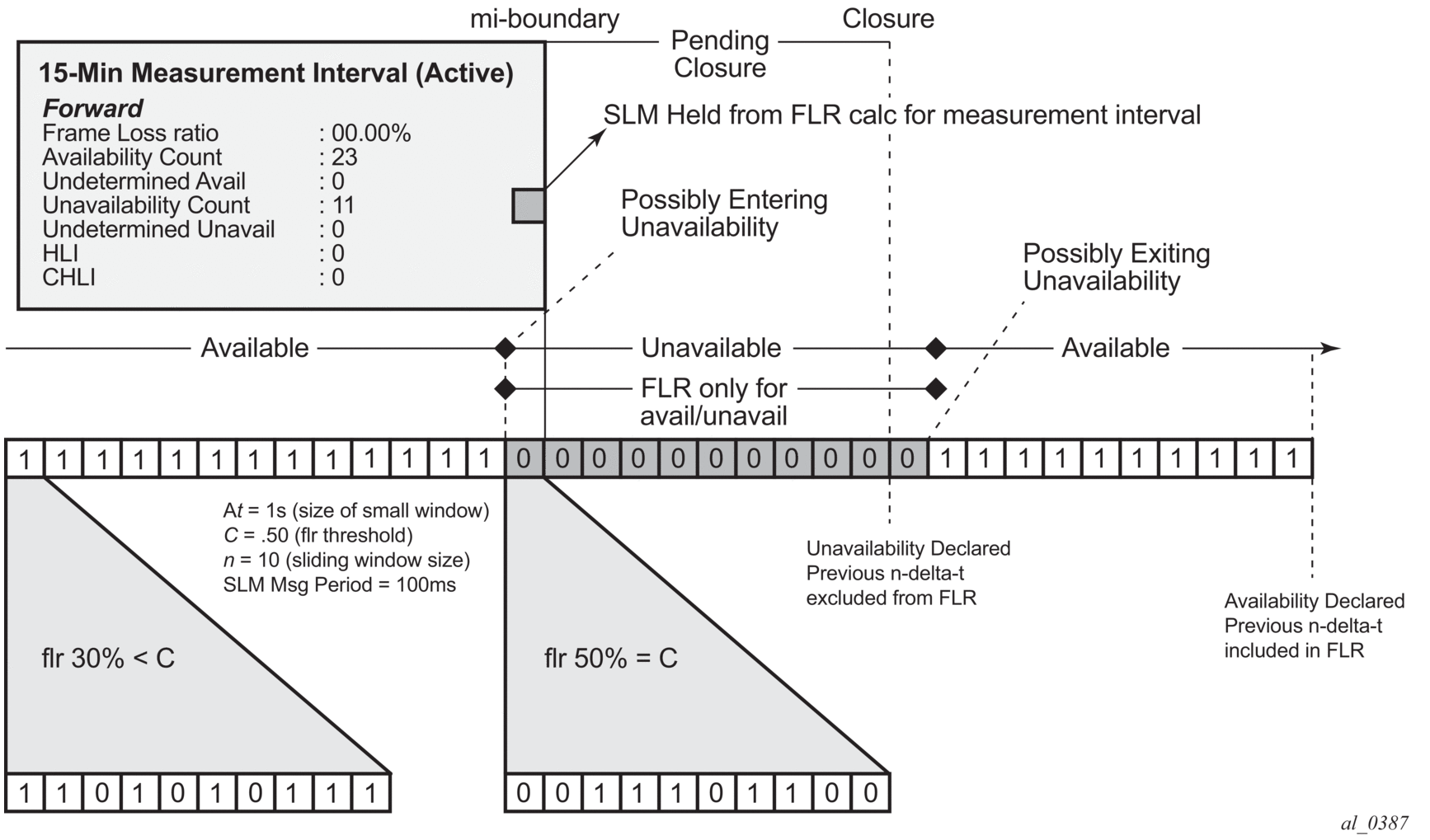 Loss events and threshold are configured within the session under the specific loss based protocol. Loss event thresholds can be applied to the average Frame Loss Ratio (FLR) in the forward and backward direction. This event is analyzed at the end of the measurement interval to see if the computed FLR is equal to or higher than the configured threshold as a percentage. The availability and reliability loss events may be configured against the counts in forward and backward direction as well as the aggregate (sum of both directions). The aggregate is only computed for thresholds and not stored as an independent value in the standard OAM-PM loss dataset. The availability and reliability loss events include the high loss interval (HLI), Consecutive HLI (CHLI), unavailability, undetermined availability, and undetermined unavailability.
