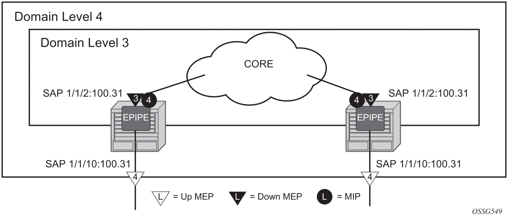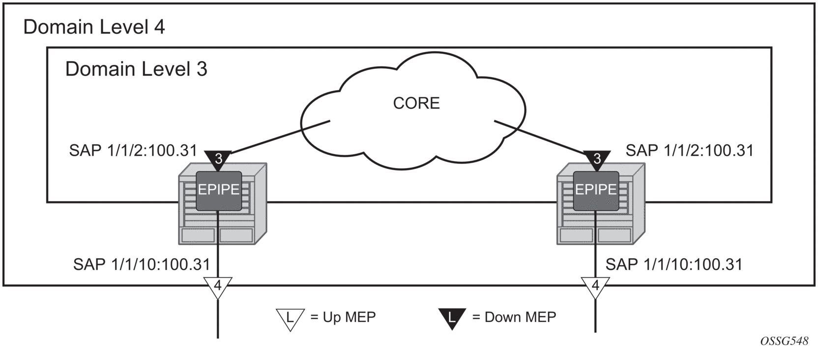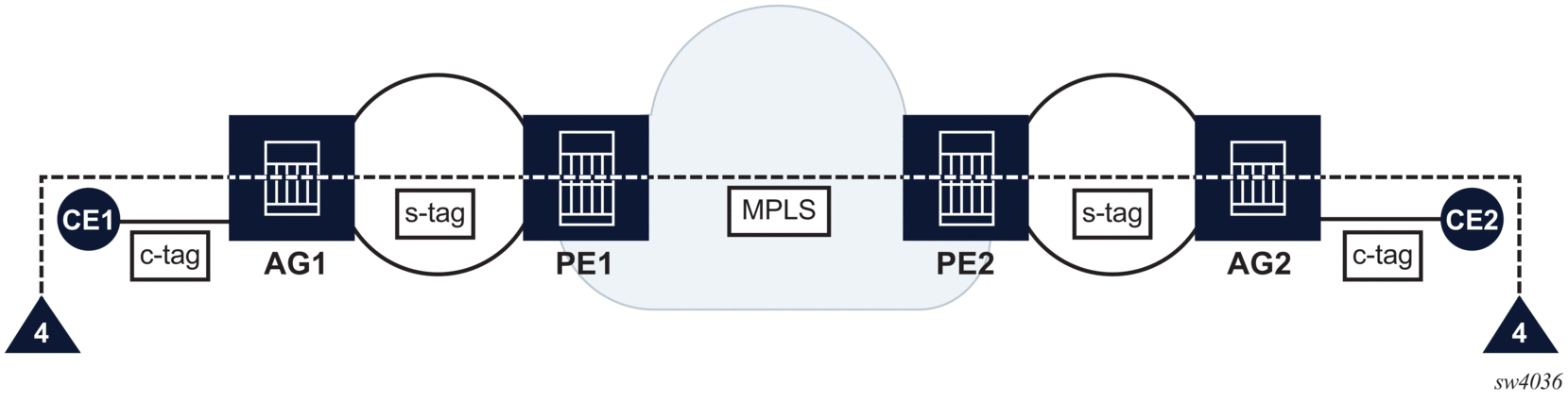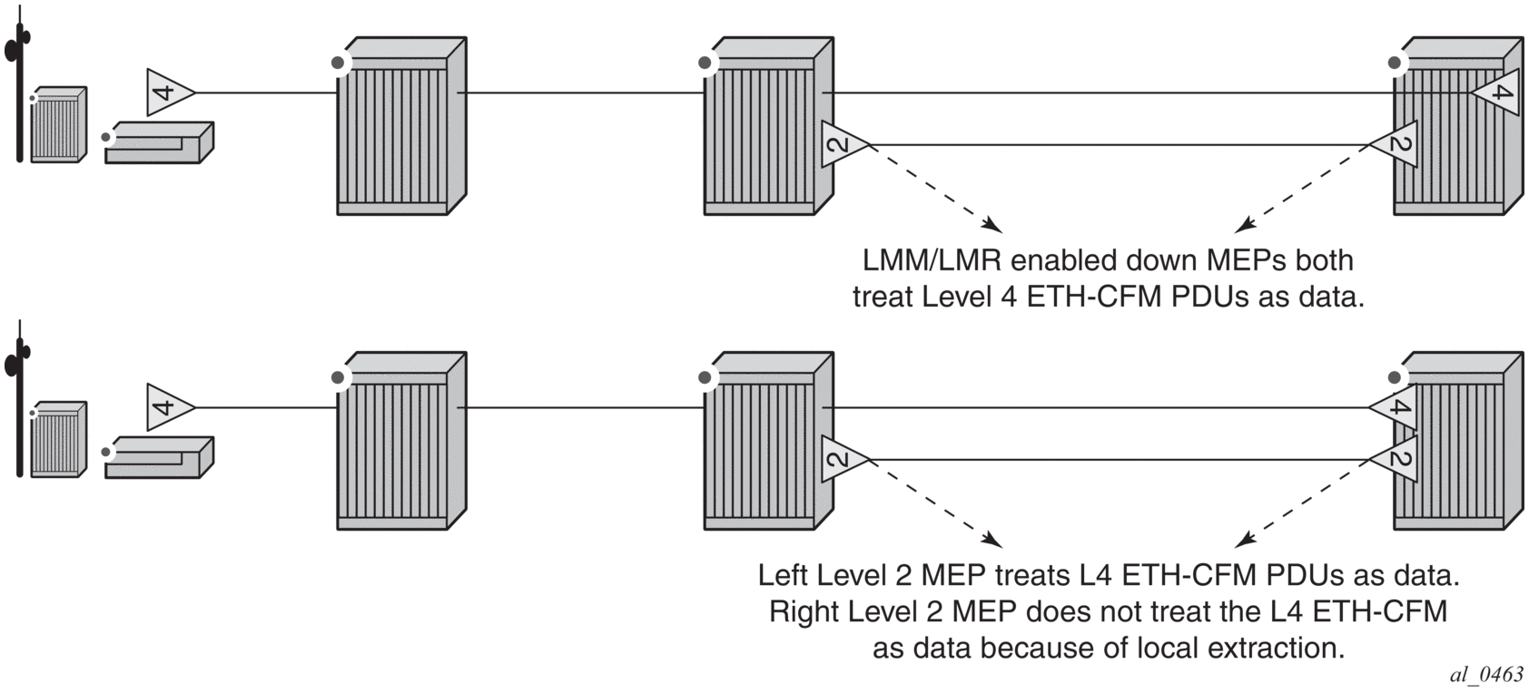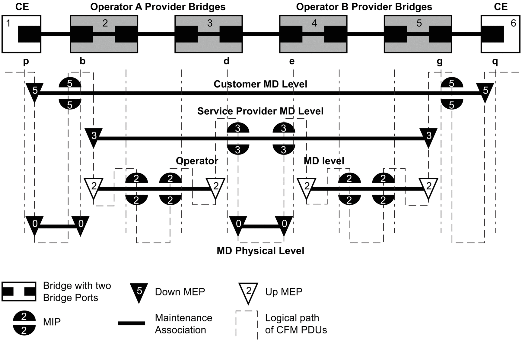 The ETH-CFM architecture defines the hierarchy that supports separation of Ethernet CFM OAM domains of responsibility. Typically, encapsulation methods are used to tunnel traffic transparently through intermediate segments. Using a network topology as shown in Figure 57, CE traffic arrives at the aggregation node and is encapsulated with a service-provider tag which hides the customer-specific tag as the packet moves through segments of the network. This method treats the ETH-CFM traffic in the same manner. The application of additional tags prevents ETH-CFM conflicts in the various Ethernet CFM OAM domains, even if the domain levels, in this case, four in this example are reused.