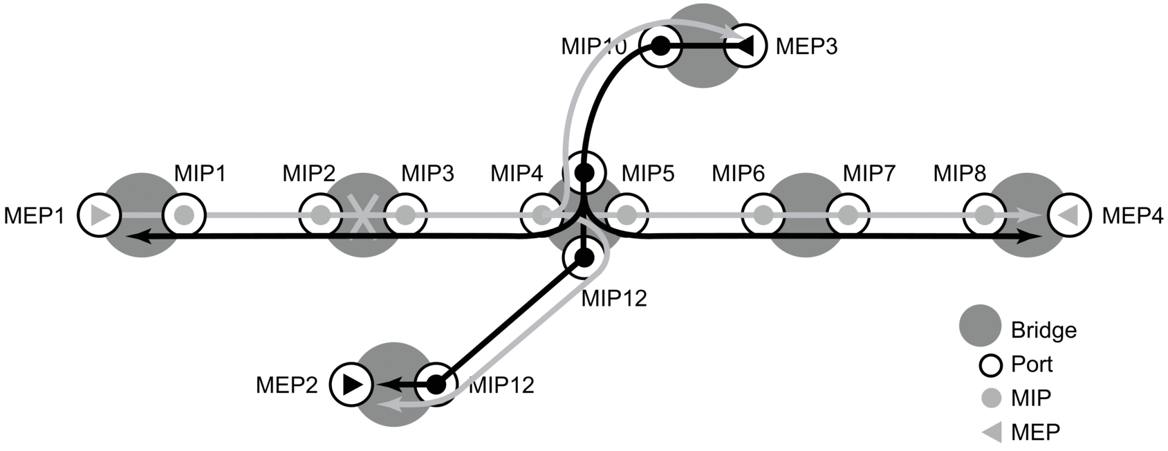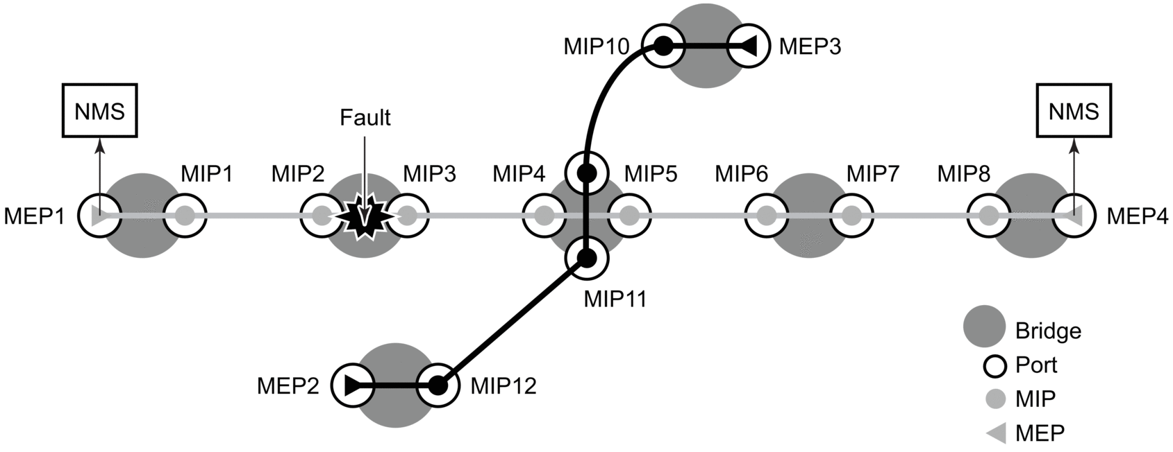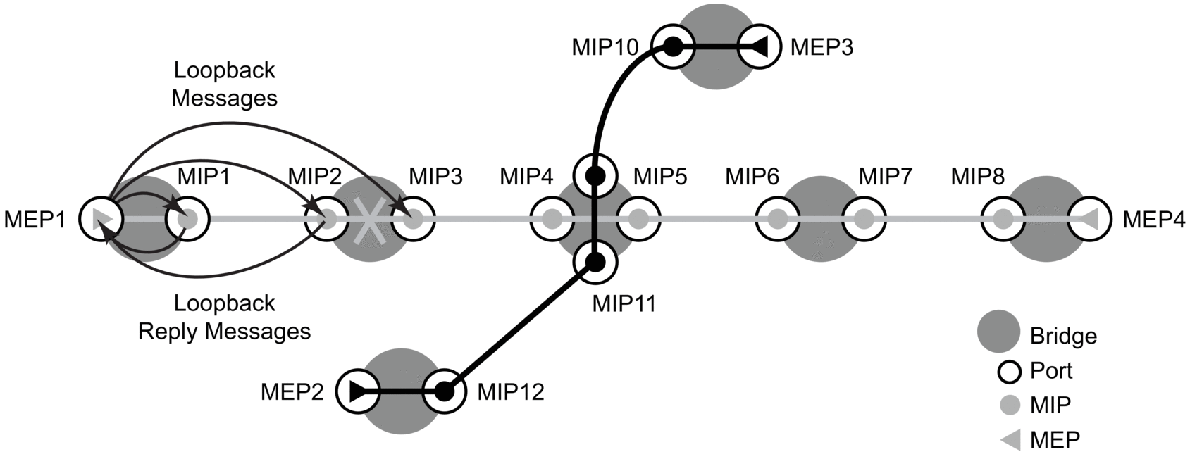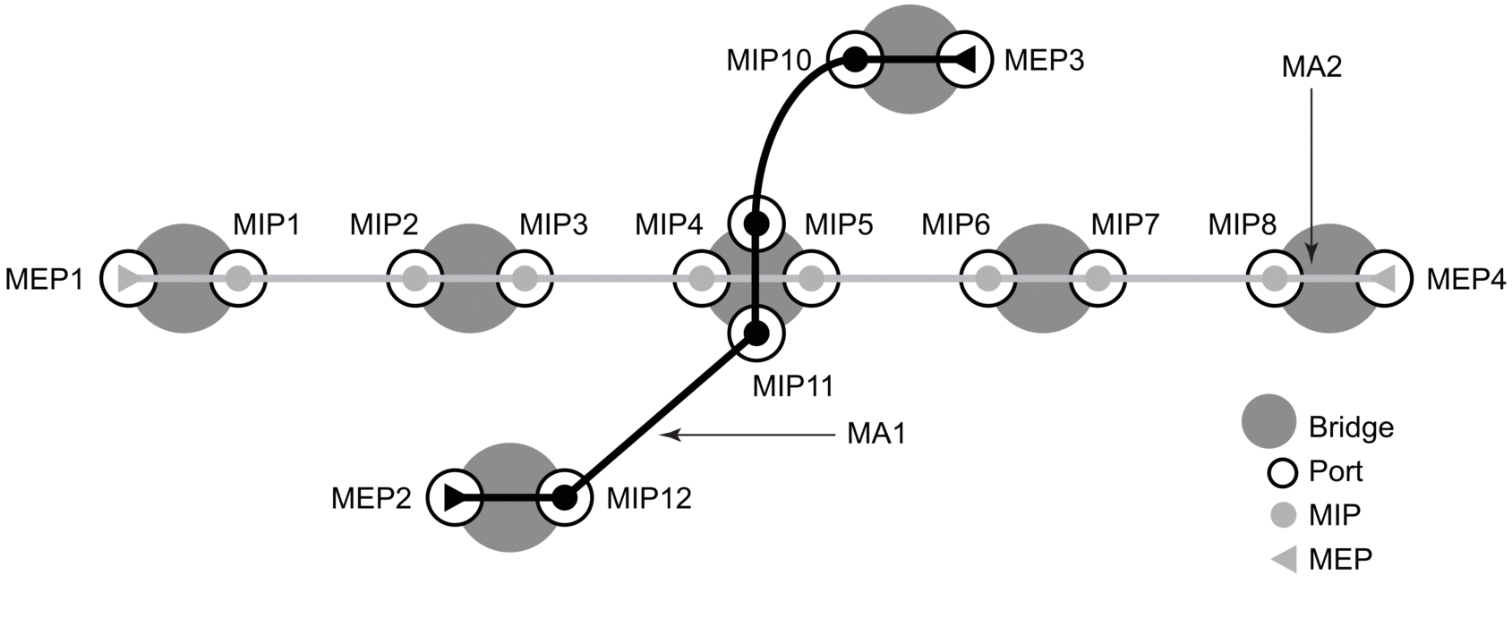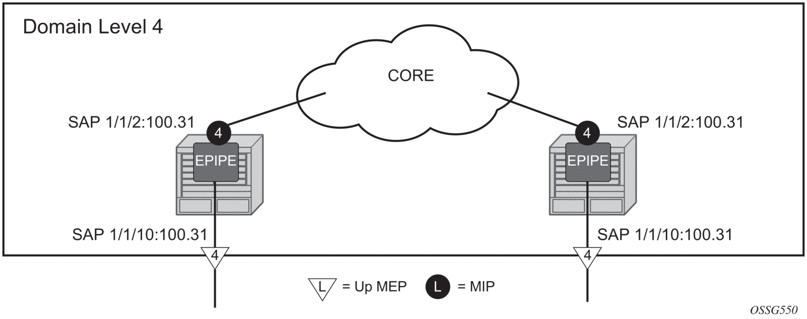 The ETH-CFM architecture defines the hierarchy that supports separation of Ethernet CFM OAM domains of responsibility. Typically, encapsulation methods are used to tunnel traffic transparently through intermediate segments. Using a network topology as shown in Figure 57, CE traffic arrives at the aggregation node and is encapsulated with a service-provider tag which hides the customer-specific tag as the packet moves through segments of the network. This method treats the ETH-CFM traffic in the same manner. The application of additional tags prevents ETH-CFM conflicts in the various Ethernet CFM OAM domains, even if the domain levels, in this case, four in this example are reused.