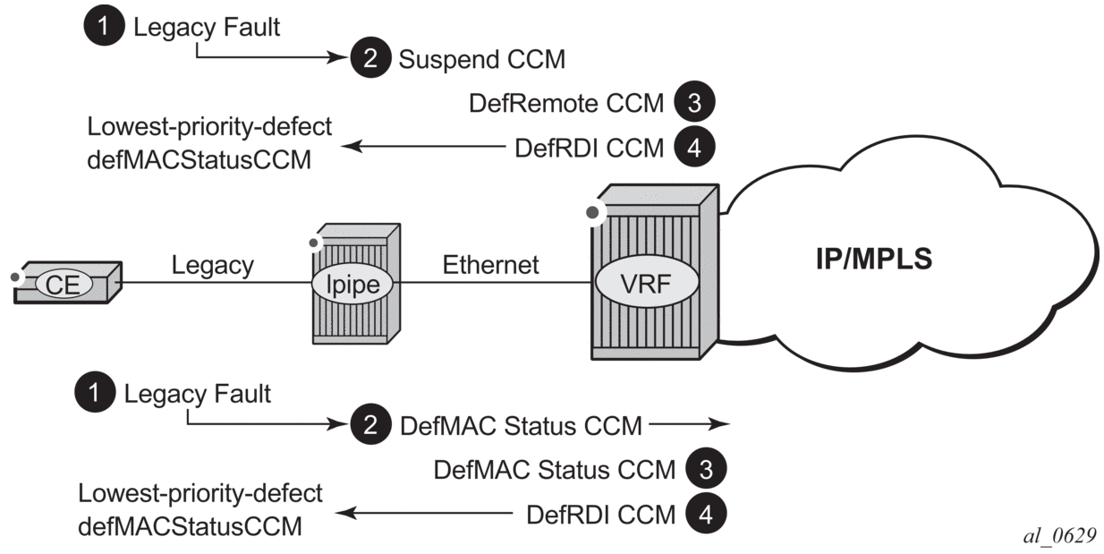 Both variants can be configured together on supported connections and within their supported services. Figure 60 shows the logical processing chain and interaction using an ingress QinQ SAP in the form VID.* and various ingress ETH-CFM MEPs. Although not shown in the Figure 60, the processing rules are the same for ingress MIPs, which are ETH-LBM (loopback) and ETH-CFM-LTM (linktrace) aware.
