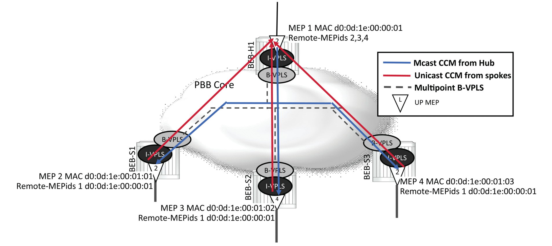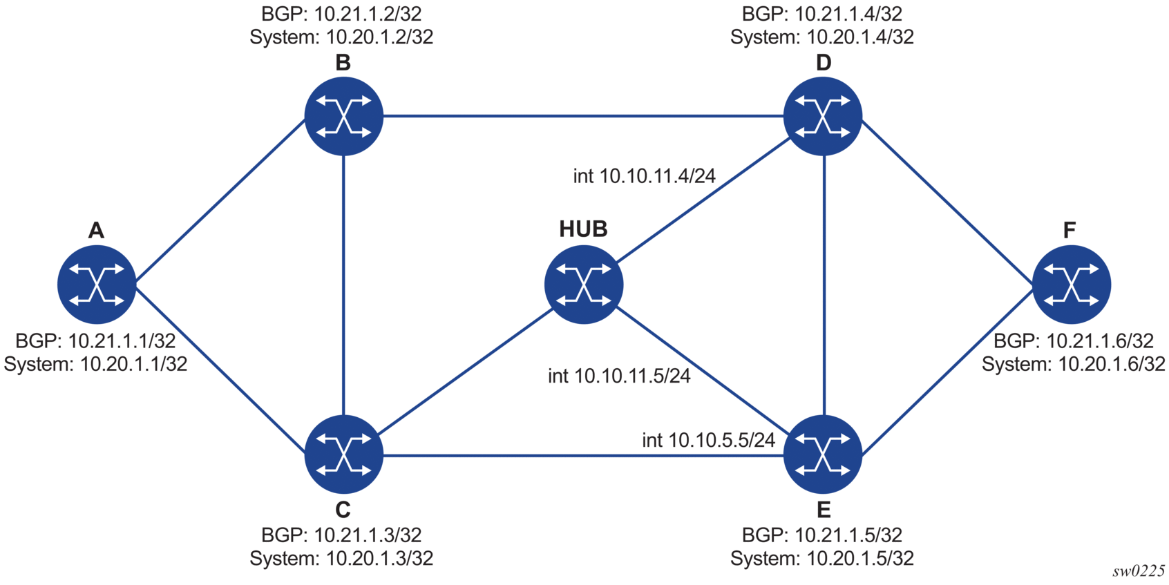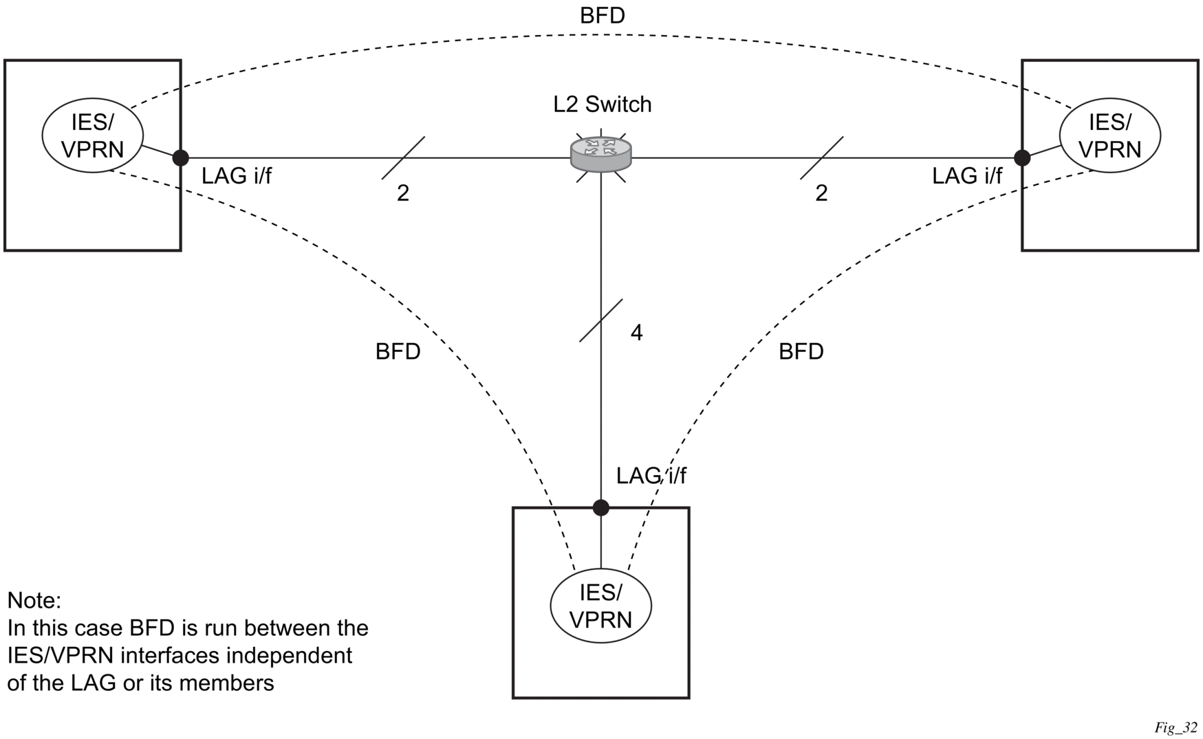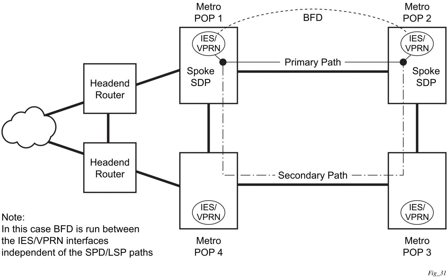One application for a central BFD implementation is so BFD can be supported over spoke SDPs used to inter-connect IES or VPRN interfaces. When there are spoke SDPs for inter-connections over an MPLS network between two routers, BFD is used to speed up failure detections between nodes so re-convergence of unicast and multicast routing information can begin as quickly as possible.
