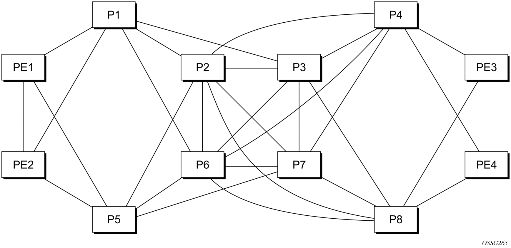 Figure 35 shows an IP/MPLS network which uses LDP ECMP for network resilience. Faults that are detected through IGP and/or LDP are corrected as soon as IGP and LDP re-converge. The impacted traffic is forwarded on the next available ECMP path as determined by the hash routine at the node that had a link failure.