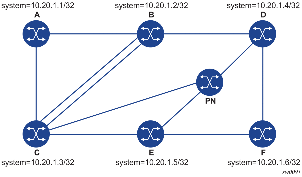 The topology, as shown in Figure 33, is used for the following SR-ISIS over RSVP-TE and SR-OSPF over RSVP-TE example outputs.