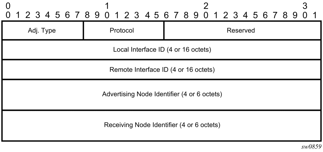 An SR-TE LSP, as a hierarchical LSP, uses the Target FEC Stack TLV, which contains a FEC element for each node SID and for each adjacency SID in the path of the SR-TE LSP. Because the SR-TE LSP does not instantiate state in the LSR other than the ingress LSR, MPLS OAM is just testing a hierarchy of node SID and adjacency SID segments towards the destination of the SR-TE LSP. The format of the node-SID is as illustrated above. Figure 28 illustrates the format for the IGP-Adjacency segment ID is as follows: