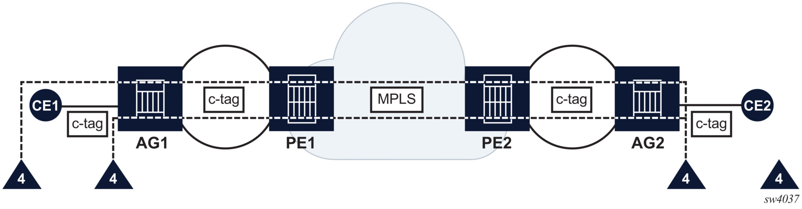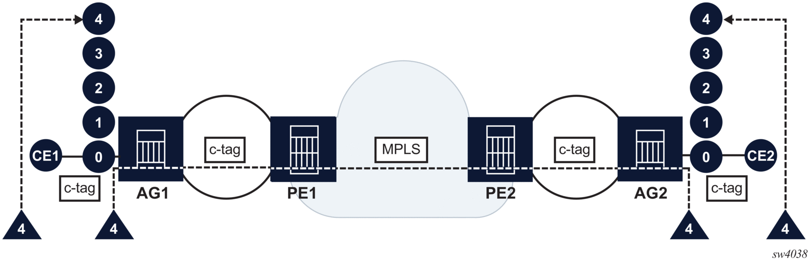In some scenarios, this additional tagging principle is not desployed and this may result in conflicts and collisions. For example, as shown in Figure 58, an additional pair of Domain Level 4 UP MEPs are configured on the aggregation nodes. These aggregation nodes are c-tag aware. The ETH-CFM packets that are transmitted from the CE pass transparently through the passive side of the MEP (the side facing away from the ETH-CFM packet transmission) and arrive on the active side of the unintended peer MEP. This could cause a number of defect conditions to occur on the unexpectedly terminating MEP and on the unreachable MEP. For simplicity, only the direction from left CE to right side of the network is shown, although the problem exists in both directions.