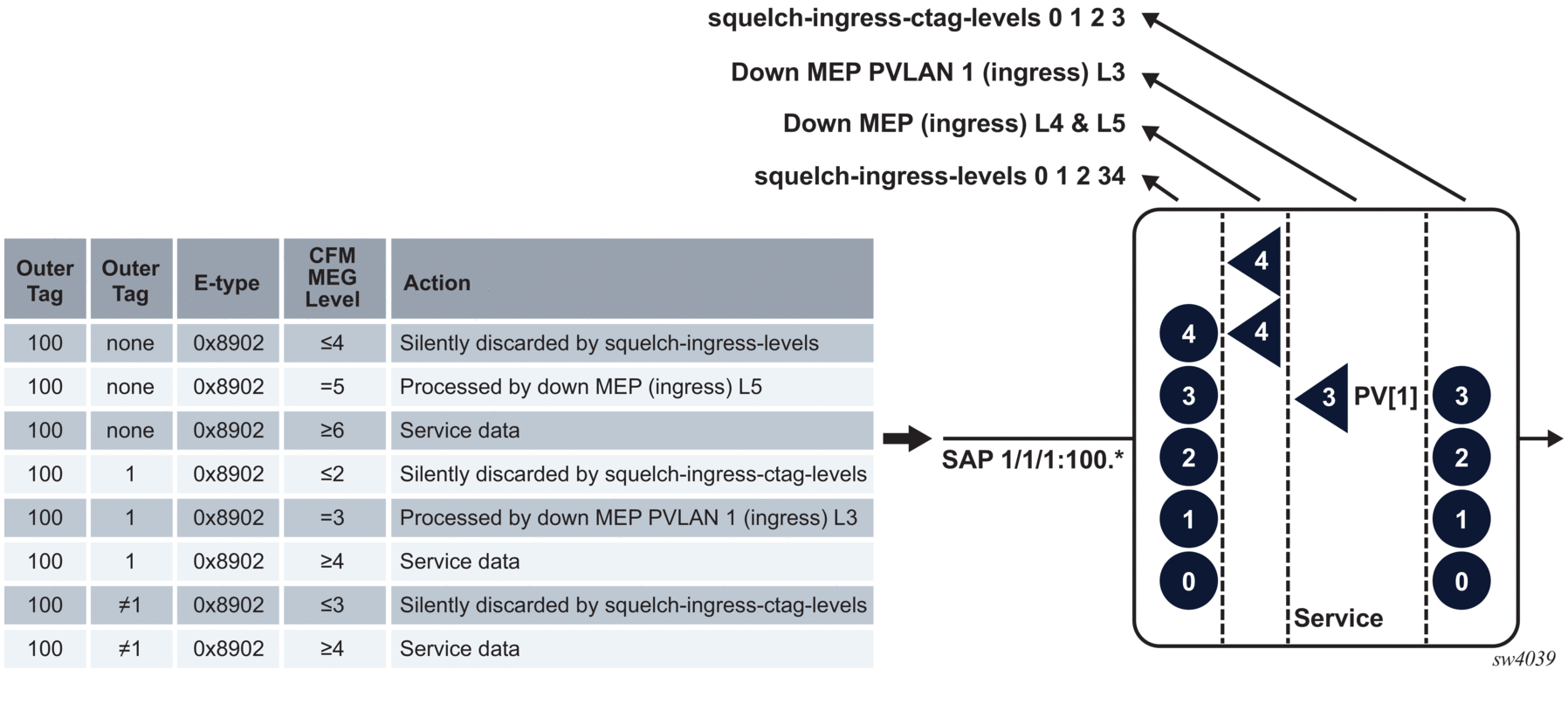 The squelch-ingress-levels command configures an exact service delineation SAP and binding match at the ingress followed immediately by Ethernet type 0x8902. This configuration silently discards the appropriate ETH-CFM packets according to the configured levels of the command, regardless of the presence of an ingress ETH-CFM management point, MEP or MIP. This squelch function occurs prior to other ETH-CFM packet processing functions.