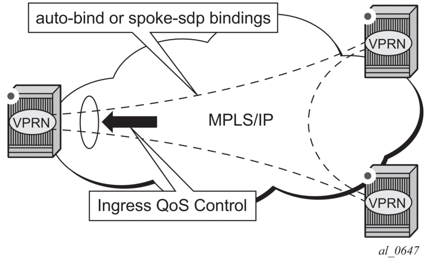 Traffic is tunneled between VPRN service instances on different PEs over service tunnels bound to MPLS LSPs or GRE tunnels. The binding of the service tunnels to the underlying transport is achieved either automatically (using the auto-bind-tunnel command) or statically (using the spoke-sdp command; not on the VPRN IP interface). QoS control can be applied to the service tunnels for traffic ingressing into a VPRN service; see Figure 18.