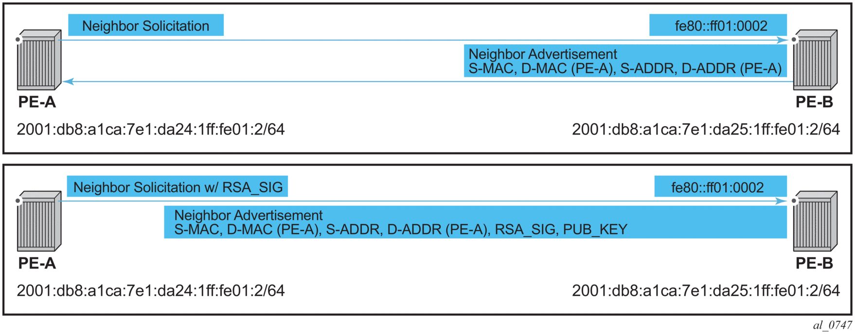 OSPFv3 IPsec support also uses IPsec transport mode packets. These packets originate from the CPM, which is considered outside the NGE domain; however, the above rules for encapsulating the packets with an NGE ESP apply and allow these packets to successfully transit the NGE domain.