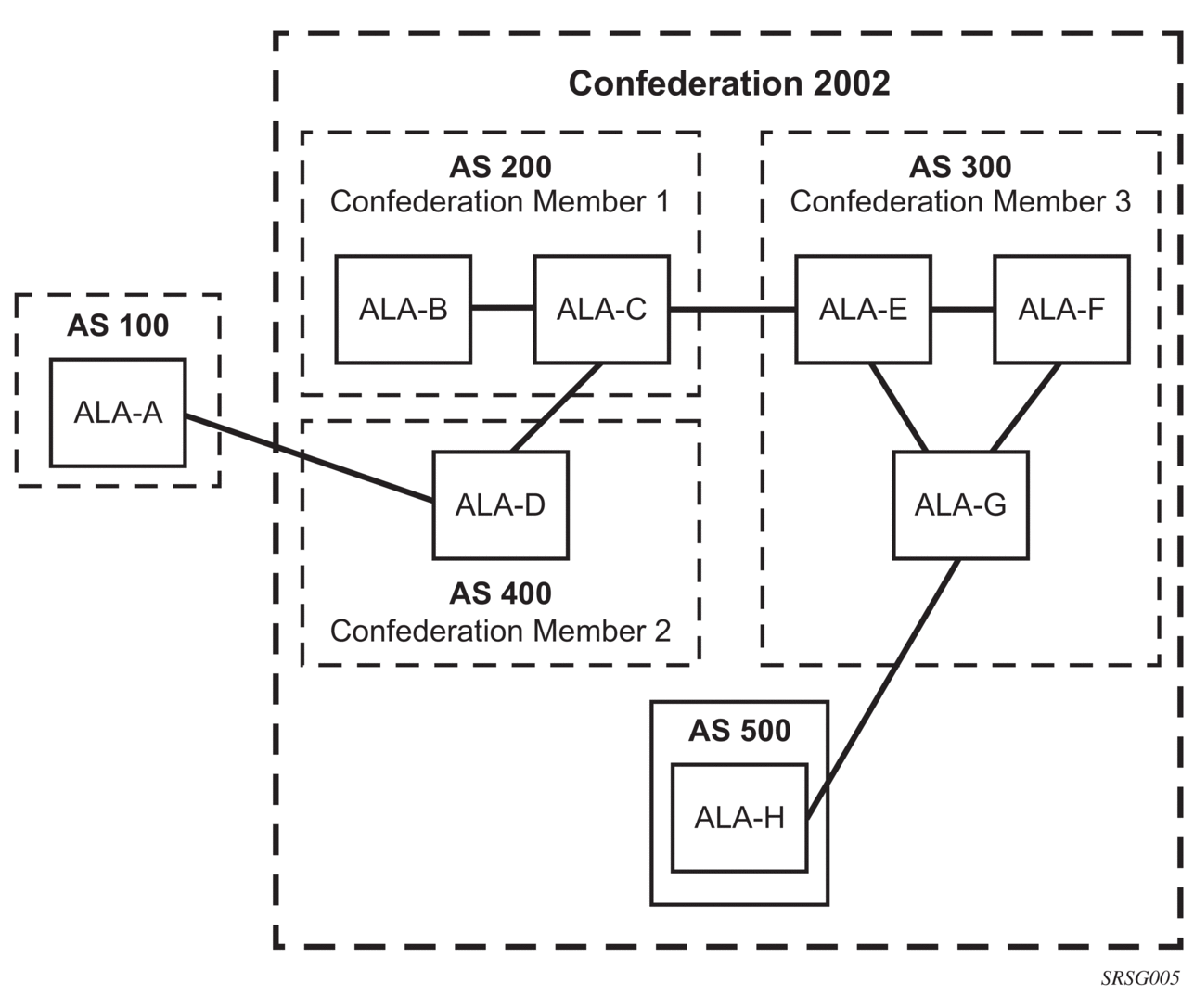There are no default confederations. Router confederations must be explicitly created. Figure 2 shows an example of a confederation configuration.