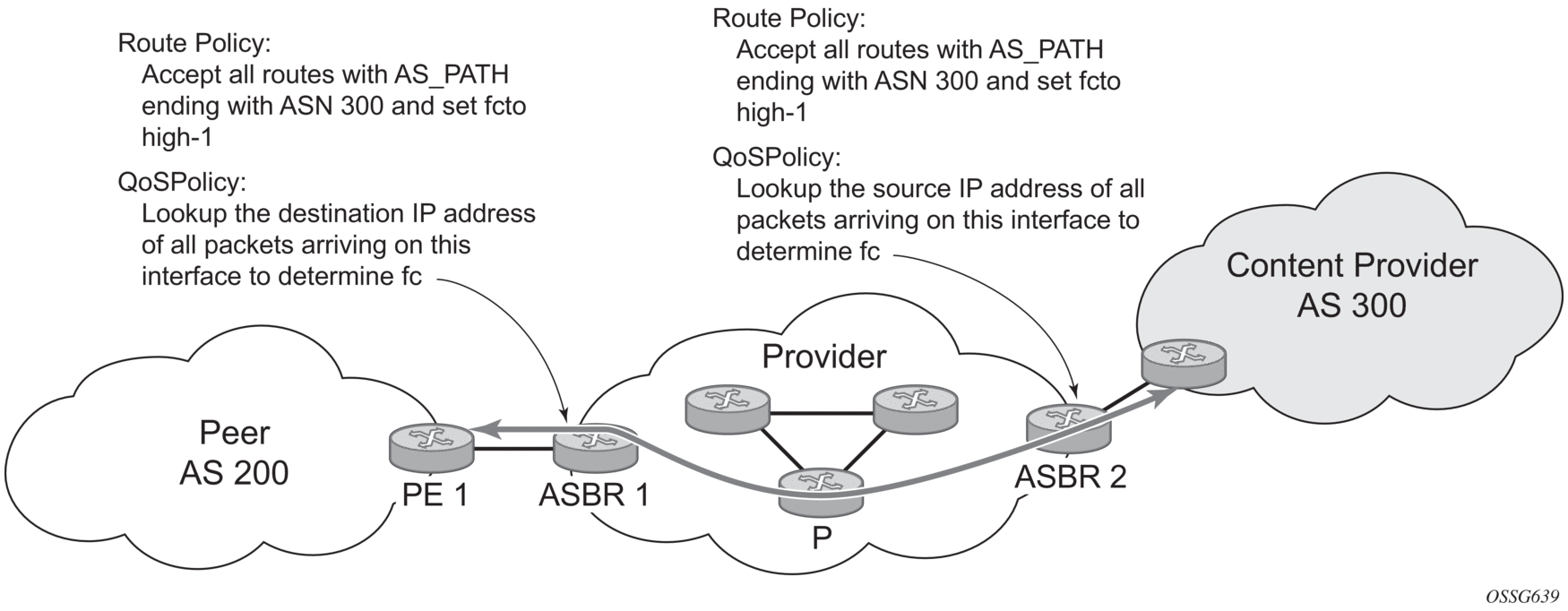 Figure 1 shows an example of an ISP that has an agreement with the content provider managing AS300 to provide traffic sourced and terminating within AS300 with differentiated service appropriate to the content being transported. In this example, ASBR1 and ASBR2 mark the DSCP of packets terminating and sourced, respectively, in AS300 so that other nodes within the ISP’s network do not need to rely on QPPB to determine the correct forwarding-class to use for the traffic. The DSCP or other CoS markings could be left unchanged in the ISP’s network and QPPB used on every node.