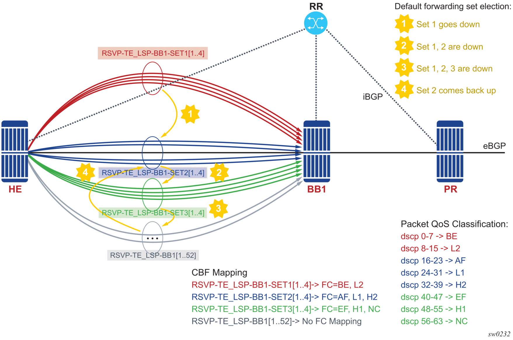 QoS policy propagation using BGP (QPPB) is a feature that allows a route to be installed in the routing table with a forwarding-class and priority so that packets matching the route can receive the associated QoS. The forwarding-class and priority associated with a BGP route are set using BGP import route policies. This feature is called QPPB, even though the feature name refers to BGP specifically. On SR OS, QPPB is supported for BGP (IPv4, IPv6, VPN-IPv4, VPN-IPv6), RIP, and static routes.