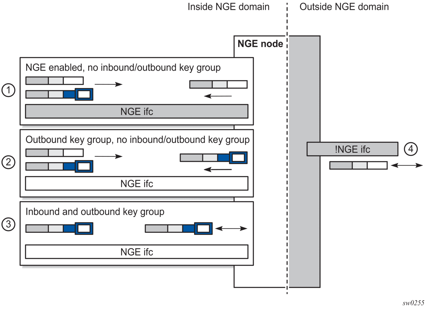 4 | Outside the NGE domain, the interface is not configured for NGE; any ESP packets are IPsec packets |