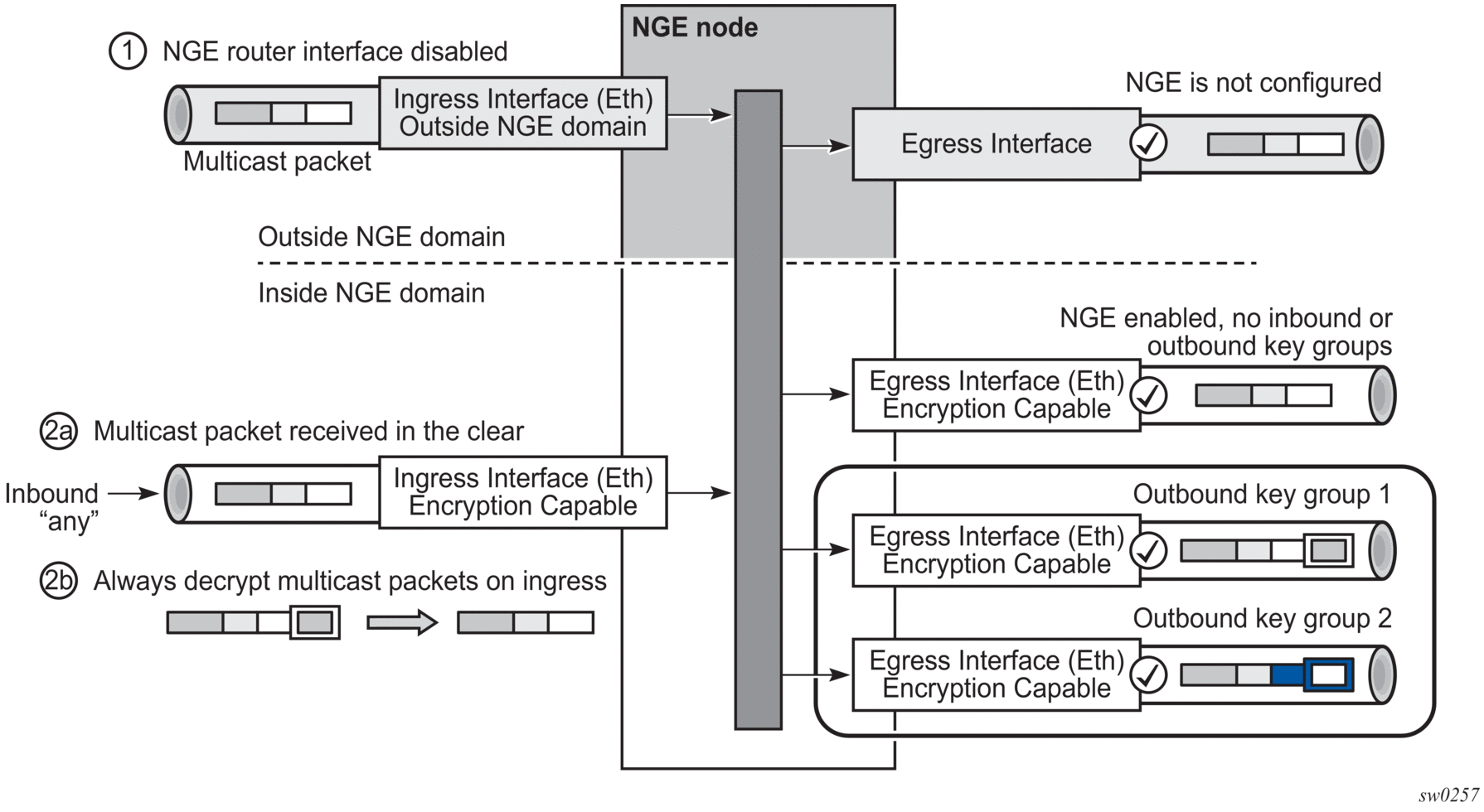 The processing rule is that multicast packets are always forwarded as clear text over the fabric. This means that for Scenario 2b, when a multicast packet is received on an encryption-capable interface and is NGE-encrypted, the packet is always decrypted first so that it can be processed in the same way as packets in Scenarios 1 and 2a.