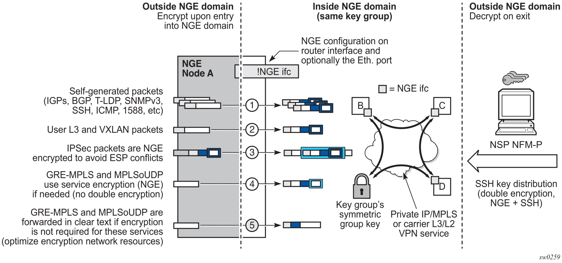 Various traffic types are supported and encrypted when entering the NGE domain, as illustrated by the following items on node A in Figure 13: