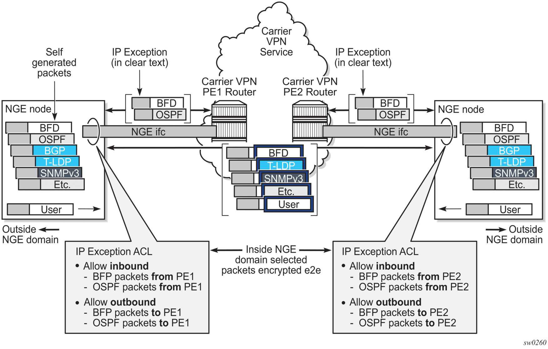 IPsec packets that originate from a router within the NGE domain are not allowed to enter the NGE domain. The only exception to this restriction is OSPFv3 packets.