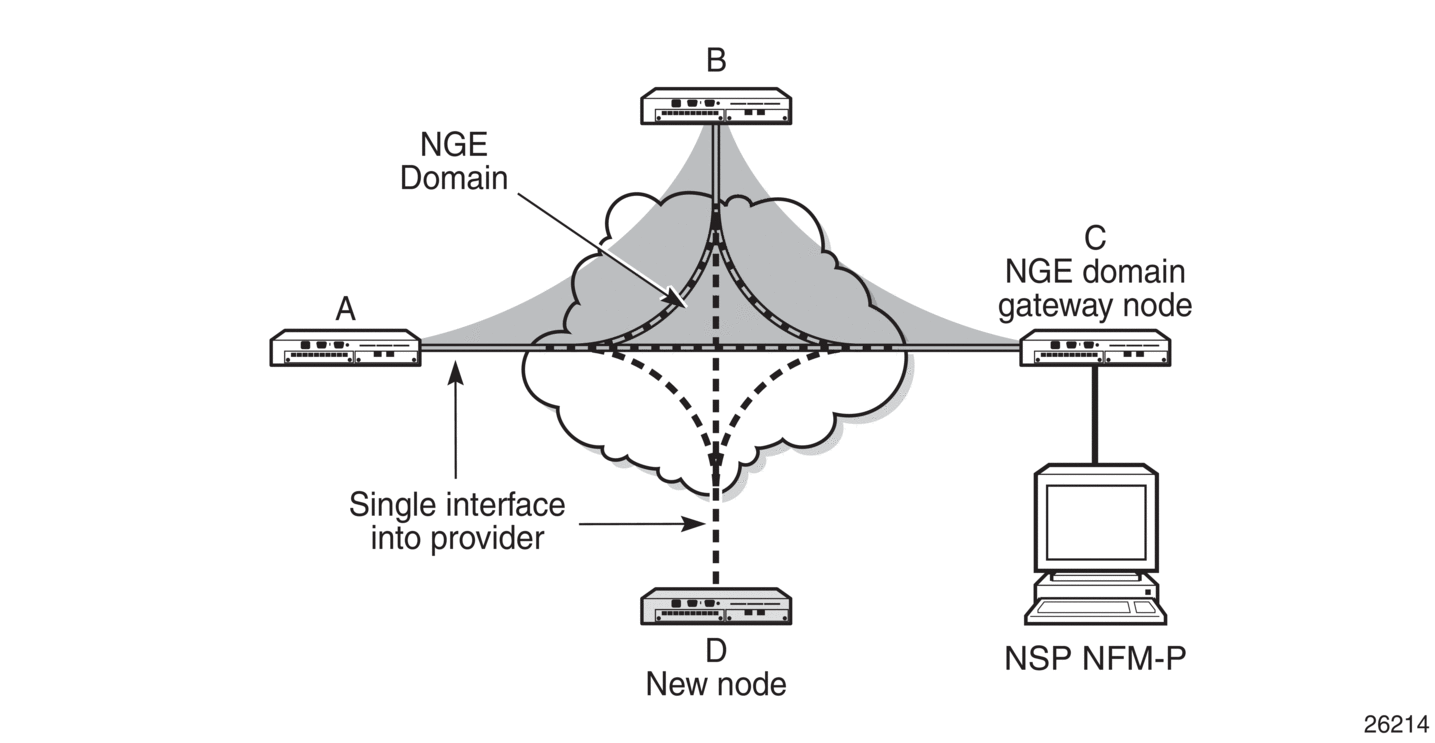 Private over intermediary network NGE domains have nodes with links that connect to a service provider network where a single link can communicate with multiple nodes over a Layer 3 service such as a VPRN. In Figure 15, node A has NGE enabled on its interface with the service provider and uses that single interface to communicate with nodes B and C, and eventually with node D when node D has been added to the NGE domain. This type of NGE domain requires the recognition of NGE gateway nodes that allow the NSP NFM-P to reach new nodes that enter the domain. Node C is designated as a gateway node.