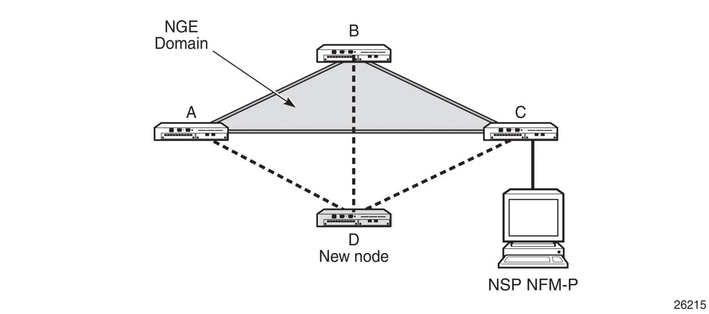 When node D is added to the NGE domain, it must first have the NGE domain key group downloaded to it from the NSP NFM-P. The NSP NFM-P creates an NGE exception ACL on the gateway node, C, to allow communication with node D using SNMPv3 and SSH through the NGE domain. After the key group is downloaded, the NSP NFM-P enables router interface encryption on node D’s interface with the service provider and node D is now able to participate in the NGE domain. The NSP NFM-P automatically removes the IP exception ACL from node C when node D enters the NGE domain.
