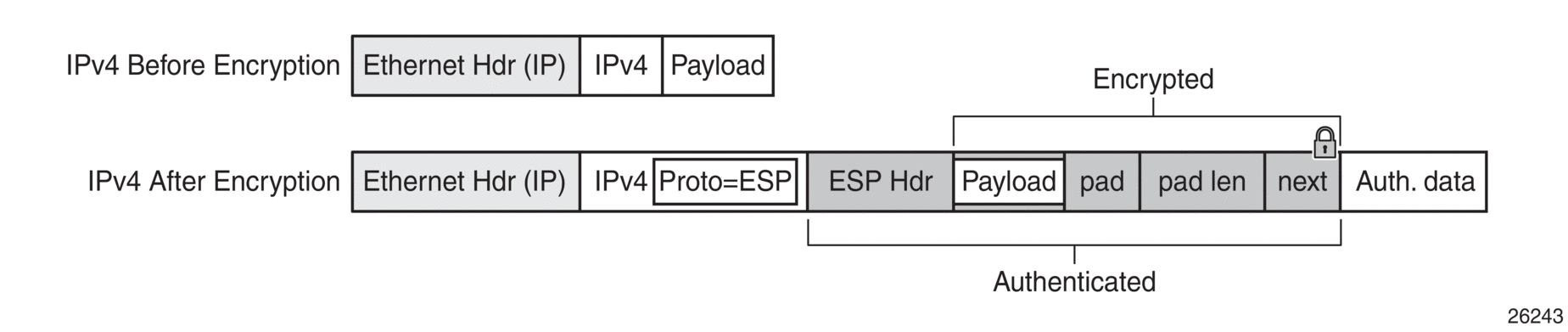 To perform encryption, router interface encryption reuses the IPsec transport mode packet format as shown in Figure 12.