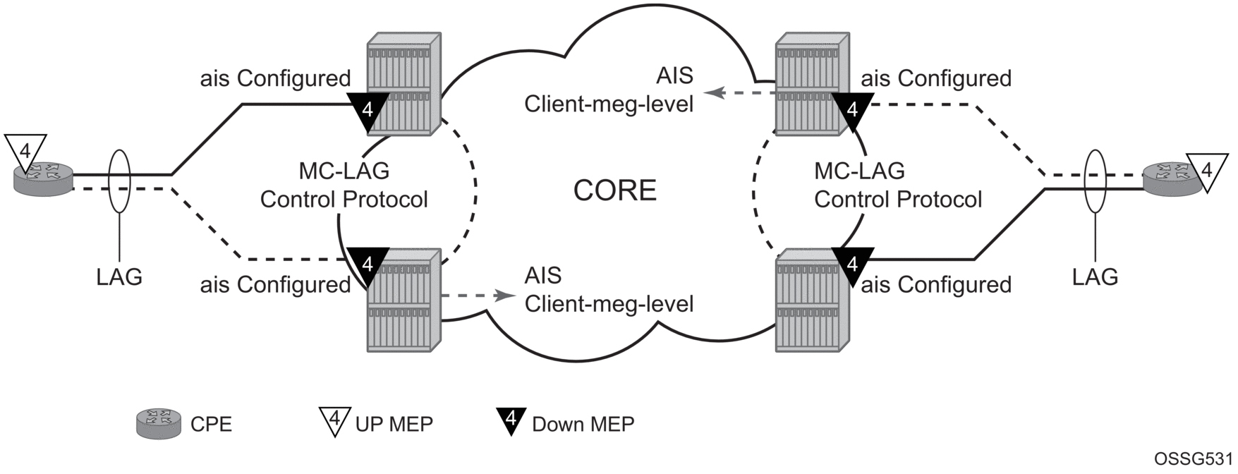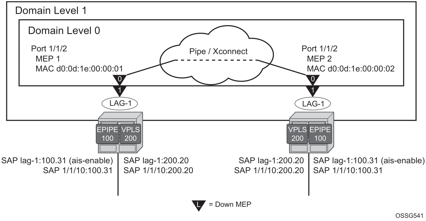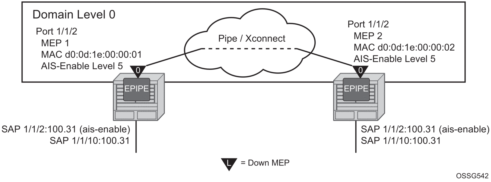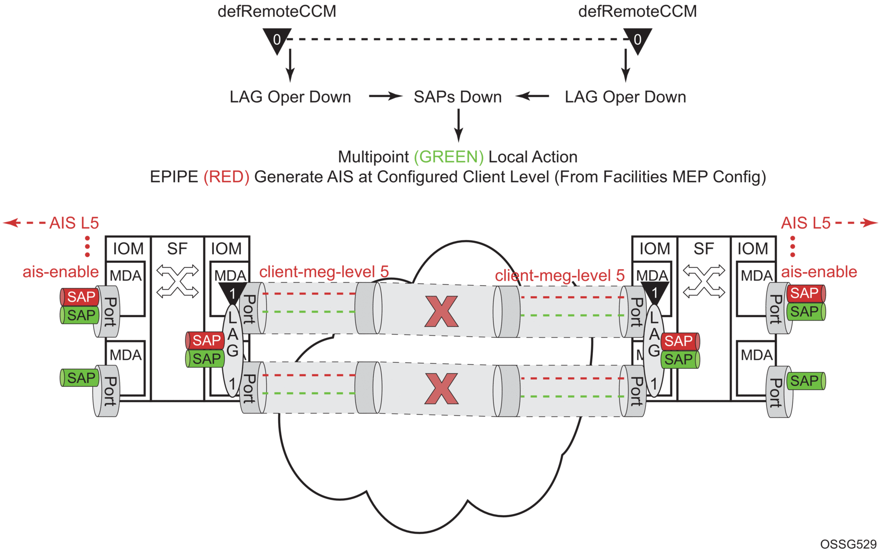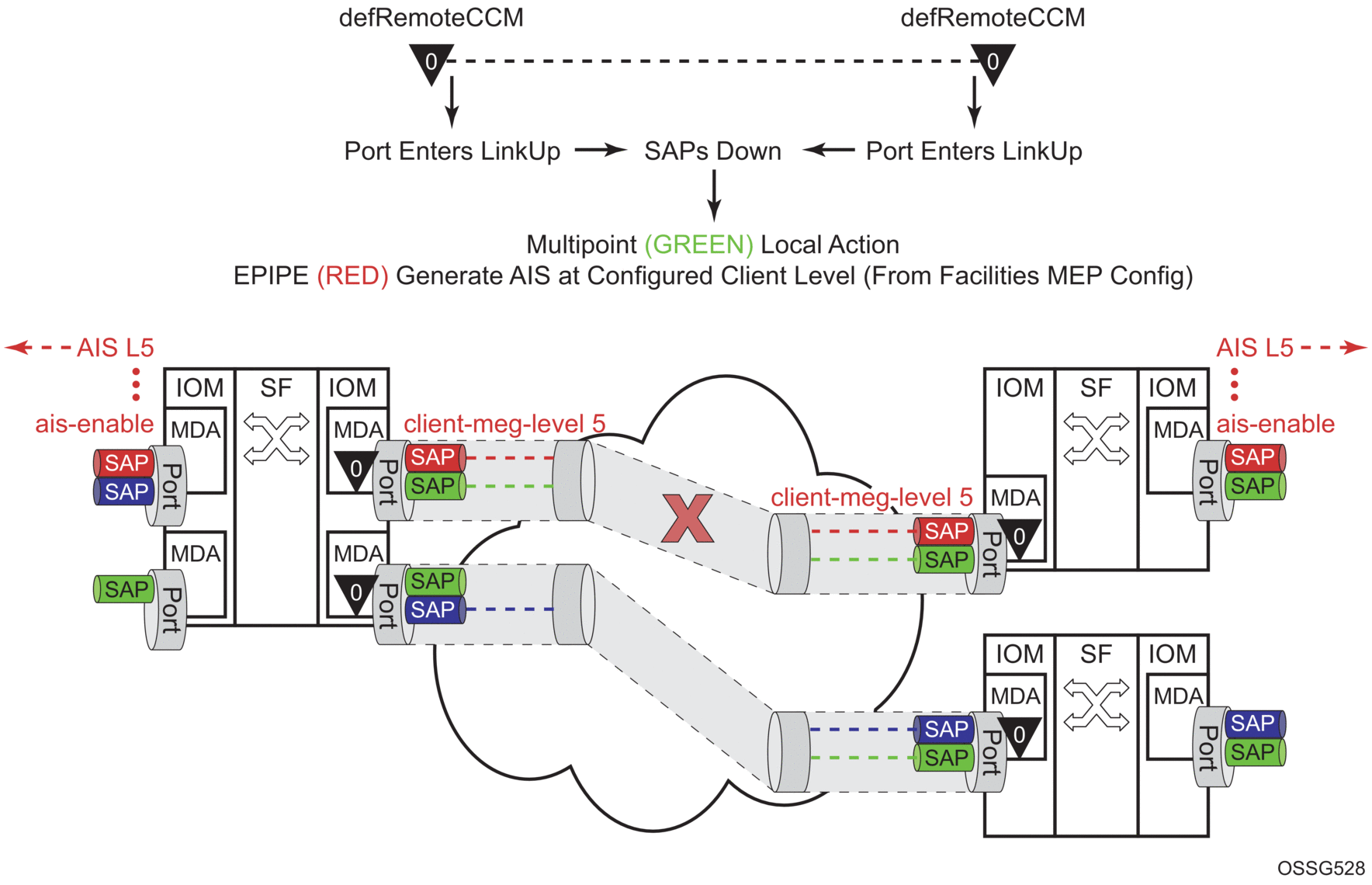 A similar condition exists if down MEPs are configured on the SAPs that are operationally down. Figure 45 shows how the same service configured with down MEPs would generate AIS, if enabled, toward the remote client at the configured client-meg-level, in the reverse direction of the MEP. This is also the proper behavior from the perspective ETH-CFM.