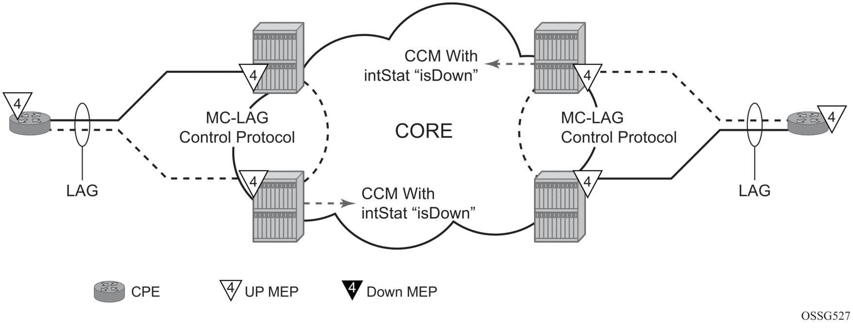 This feature relies on the proper configuration, design, and deployment of the MC-LAG protocol. There are numerous optimizations and configuration parameters that are available as part of the MC-LAG functions. For example, by default, when a currently active MC-LAG port transitions to standby, by any means including manual operator intervention, the remote node terminating the standard LAG sees the LAG transition because all ports in the LAG are down for an instance in time. This is standard LAG behavior does not change as a result of the linkage of MP state to MC-LAG state. This transition causes the propagation of faults for MEPs configured on that node. Normal architectural LAG design must take these types of events into consideration. MC-LAG provides numerous tuning parameters that need to be considered before deploying in the field. These include a hold-time down option on the node terminating the standard LAG, as well as other parameters for revertive behavior such as the hold-time up option. It is important to ensure that the operator’s specific environment be taken into consideration when tuning the MC-LAG parameters to avoid the propagation of error conditions during normal recover events. In the case that the resumption of data forwarding exceed the timeout value of a MEP (3.5 times the CCM-Interval), the appropriate defect conditions are raised.