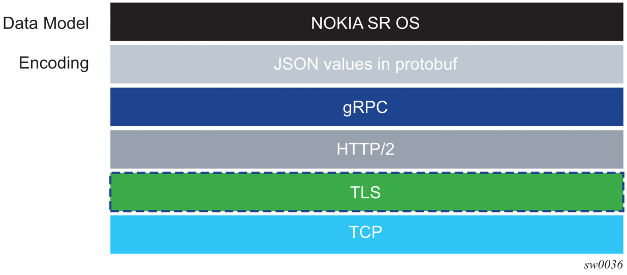 If TLS is not enabled, gRPC messages are not encrypted and usernames and passwords required in gRPC communication are visible to anyone capturing the packets. Therefore, Nokia recommends disabling TLS encryption only in a closed environment.