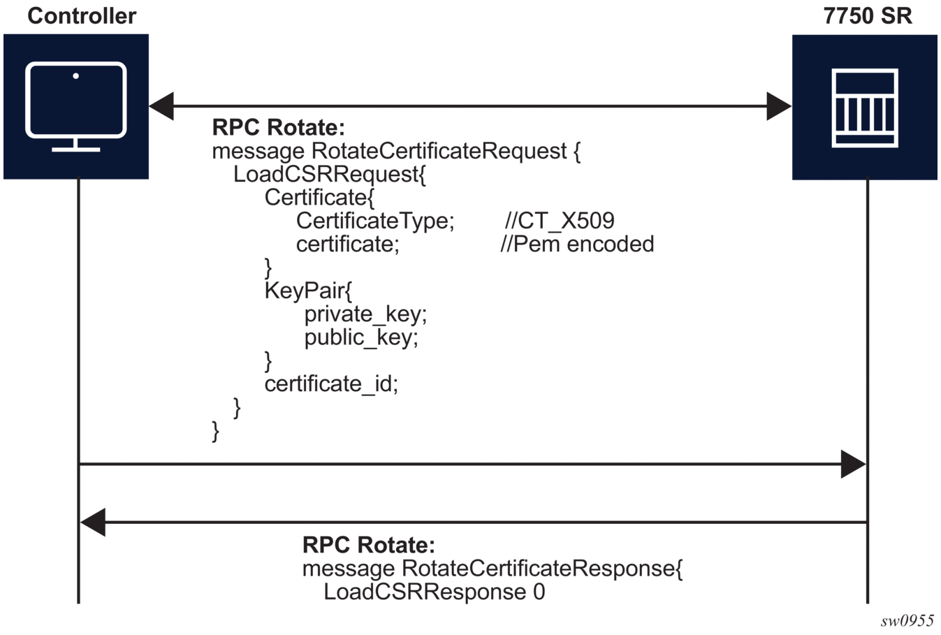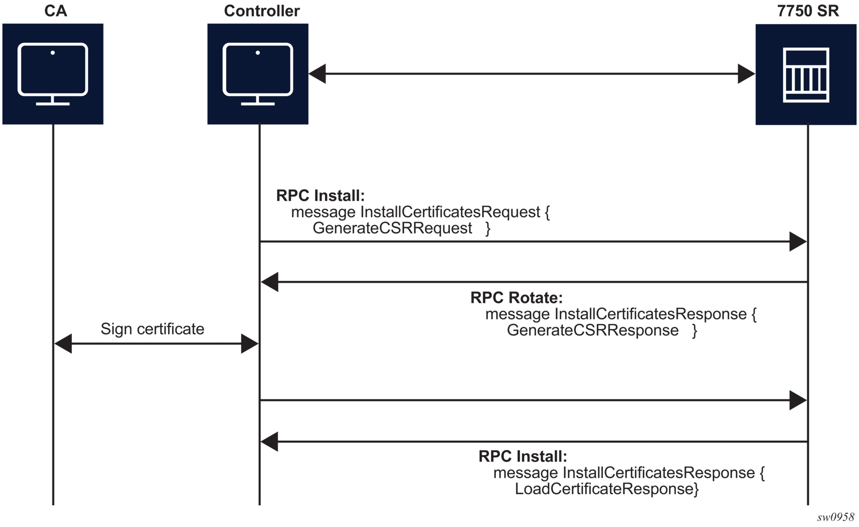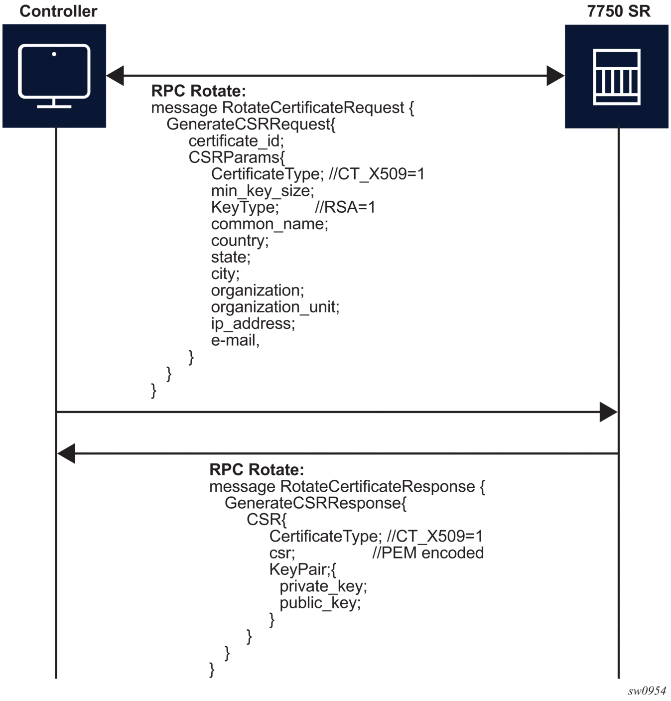 For RPC Rotate, the certificate_id points to an existing certificate on the node. All the other parameters in the GenerateCSRRequest message are not checked by the SR OS software explicitly. They are used by the internal API to generate the CSR and that result is transparently passed to the controller.