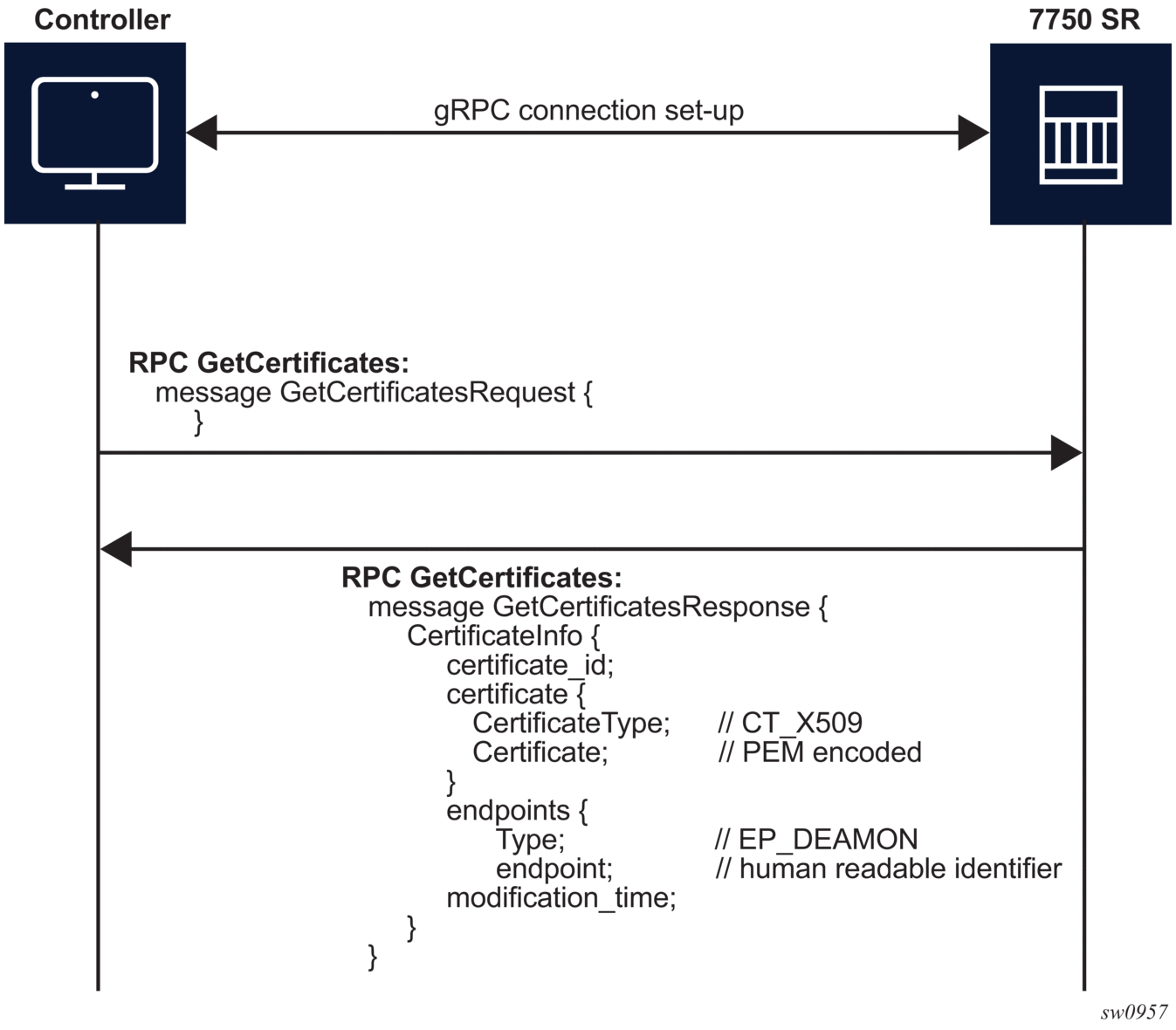RPC GetCertificates provide information to the controller about all active certificates on the server (SR OS node). Figure 26 shows the message sequence.