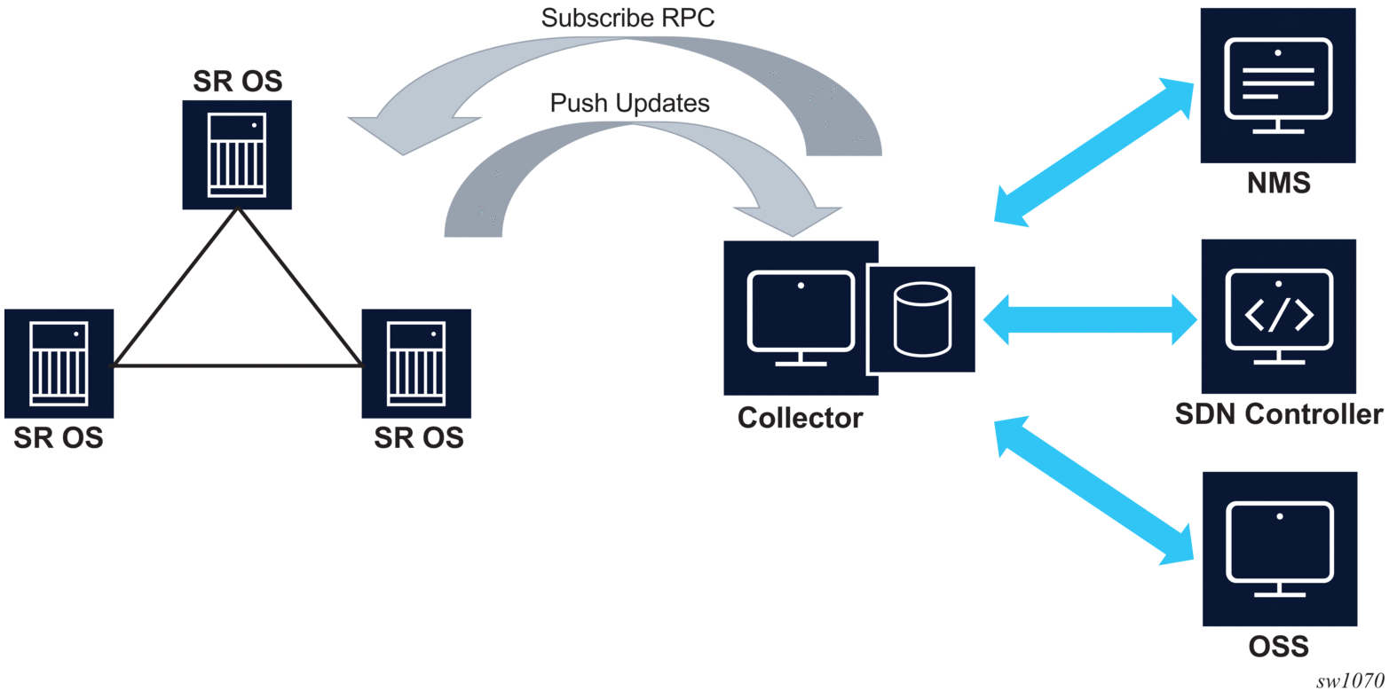 When the data collector initiates the gRPC connection, the SR OS node assumes the role of the gRPC server and the collector is the client. This is referred to as dial-in telemetry, where the SR OS node pushes data to the receiver (collector). Figure 23 shows the telemetry session initiated from the collector to the SR OS node via the Subscribe RPC.