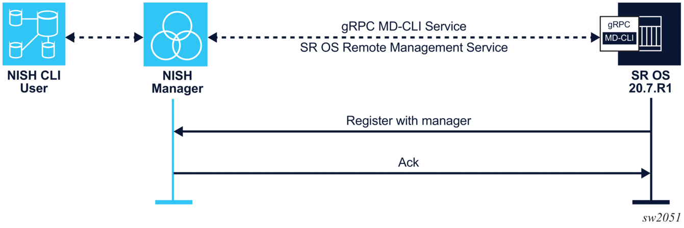 When a remote NISH manager is configured, the SR OS node initiates a gRPC session with the configured manager. The SR OS node sends a message to communicate its name, IP address (IPv4 and IPv6 are supported), and gRPC port to the NISH manager. The NISH manager responds with an acknowledgment message. The SR OS node periodically checks in with the NISH manager.