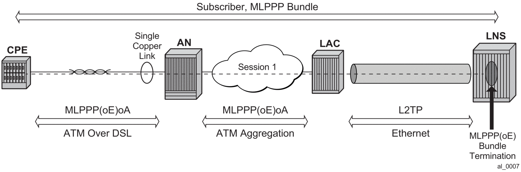 The term MLPPPoX is used to reference MLPPP sessions over ATM transport (oA), Ethernet over ATM transport (oEoA) or Ethernet transport (oE). Although MLPPP in subscriber management context is not supported natively over PPP/HDLC links, the terms MLPPP and MLPPPoX terms can be used interchangeably. The reason for this is that link bundling, MLPPP encapsulation, fragmentation and interleaving can be in a broader scope observed independently of the transport in the first mile. However, MLPPPoX terminology prevails in this section in an effort to distinguish MLPPP functionality on an ASAP MDA (outside of ESM) and MLPPPoX in LNS (inside of ESM).