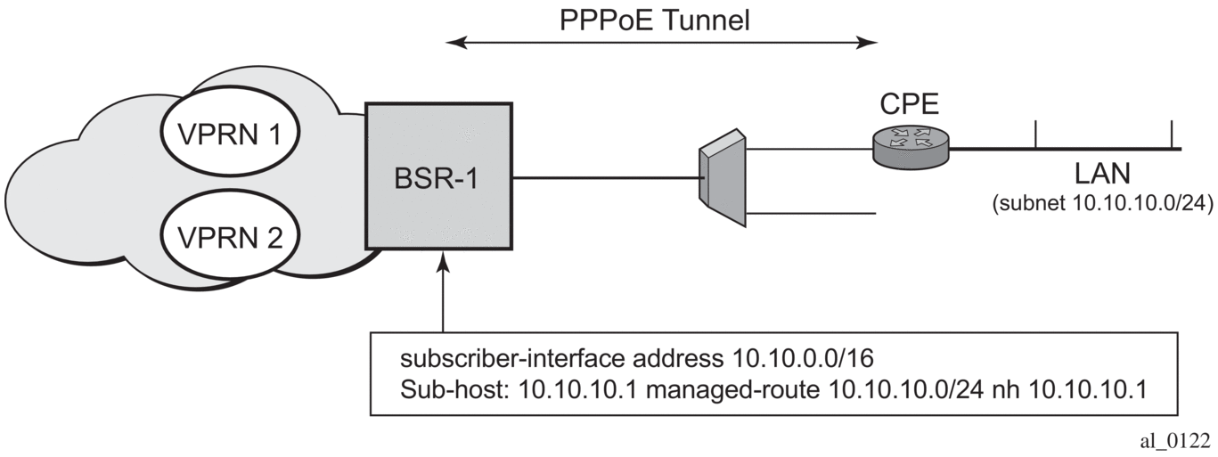 From a BNG perspective, the given PPPoE host is allocated a subnet (instead of /32) by RADIUS, external dhcp-server, or local-user-db. And locally, the host is associated with managed-route. This managed-route is a subset of the subscriber-interface subnet, and also, subscriber-host ip-address is from managed-route range. The negotiation between BNG and CPE allows CPE to be allocated both ip-address and associated subnet.