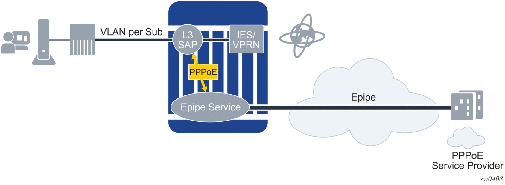 PPPoE-capable interfaces can be created in a subscriber interface in both IES and VPRN services (VPRN is supported on the 7750 SR only). Each SAP can support one or more PPPoE sessions depending on the configuration. A SAP can simultaneously have static hosts, DHCP leases and PPPoE sessions. See Limiting Subscribers, Hosts, and Sessions for a detailed description of the configuration options to limit the number of PPPoE sessions per SAP, per group-interface, per SLA profile instance, or per subscriber.