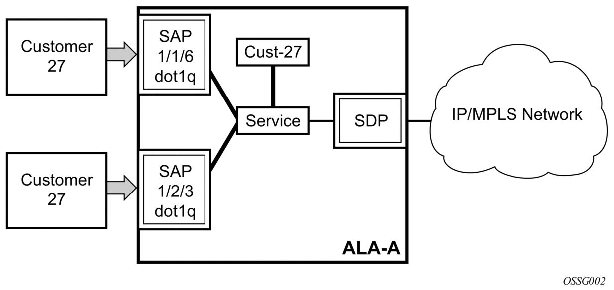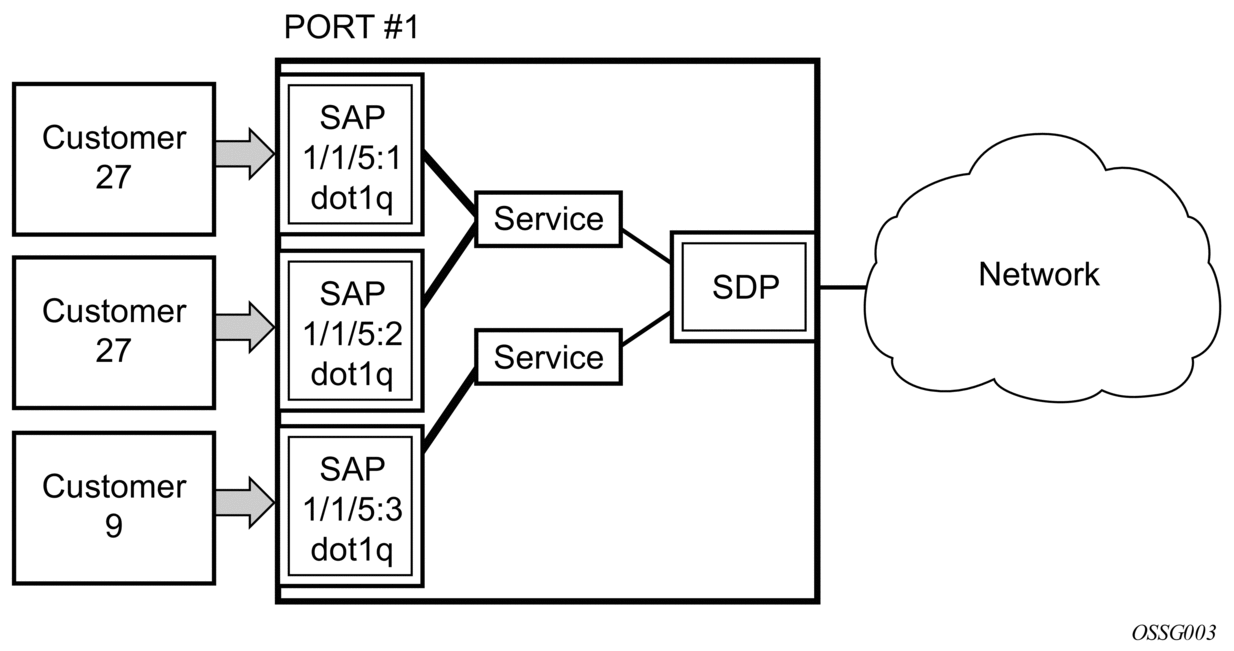 Each SAP configuration includes a specific port or channel (applies to the 7750 SR) on which service traffic enters the router from the customer side (also called the access side). Each port is configured with an encapsulation type. If a port is configured with an IEEE 802.1Q (referred to as dot1q) encapsulation, then a unique encapsulation value (ID) must be specified.