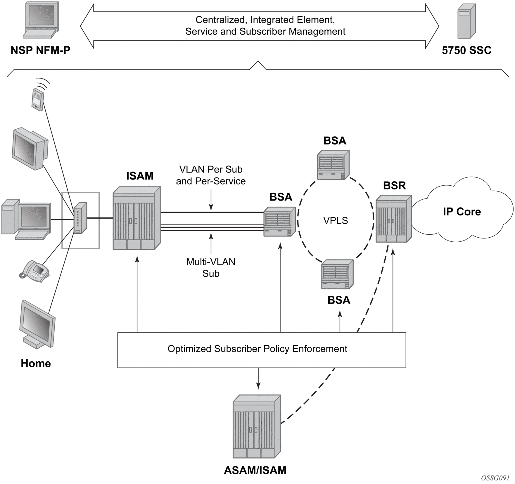 Digital subscriber line access multiplexers (DSLAMs) or other access nodes are connected to Ethernet access ports on the BSA. Typically a single VLAN per subscriber is configured between the access node and the BSA. A VLAN per subscriber provides a persistent context against which per-subscriber policies (QoS, filtering, accounting) can be applied in the BSA.