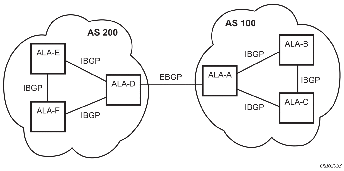 An IBGP session is formed when the two BGP routers belong to the same Autonomous System. Routes received from an IBGP peer are not advertised to other IBGP peers unless the router is a route reflector. The two routers that form an IBGP session are usually not directly connected. Figure 34 shows an example of two Autonomous Systems that use BGP to exchange routes. In this example the router ALA-A forms IBGP sessions with ALA-B and ALA-C.