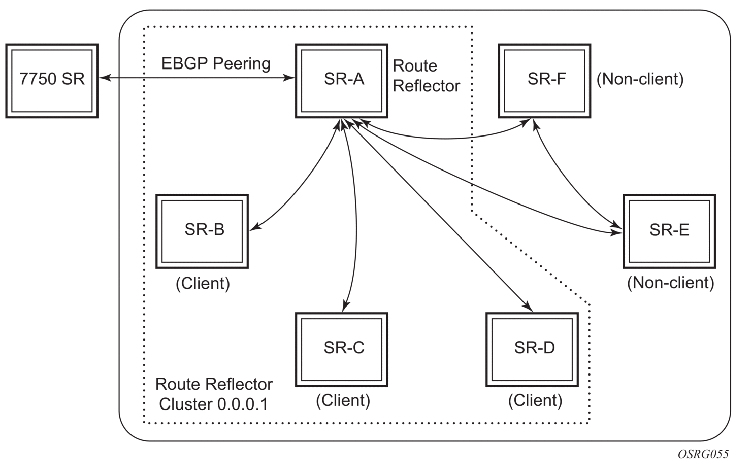 Figure 36 depicts the same network as Figure 35 but with route reflectors deployed to eliminate the IBGP mesh between SR-B, SR-C, and SR-D. SR-A, configured as the route reflector, is responsible for reflection routes to its clients SR-B, SR-C, and SR-D. SR-E and SR-F are non-clients of the route reflector. As a result, a full mesh of IBGP sessions must be maintained between SR-A, SR-E and SR-F.