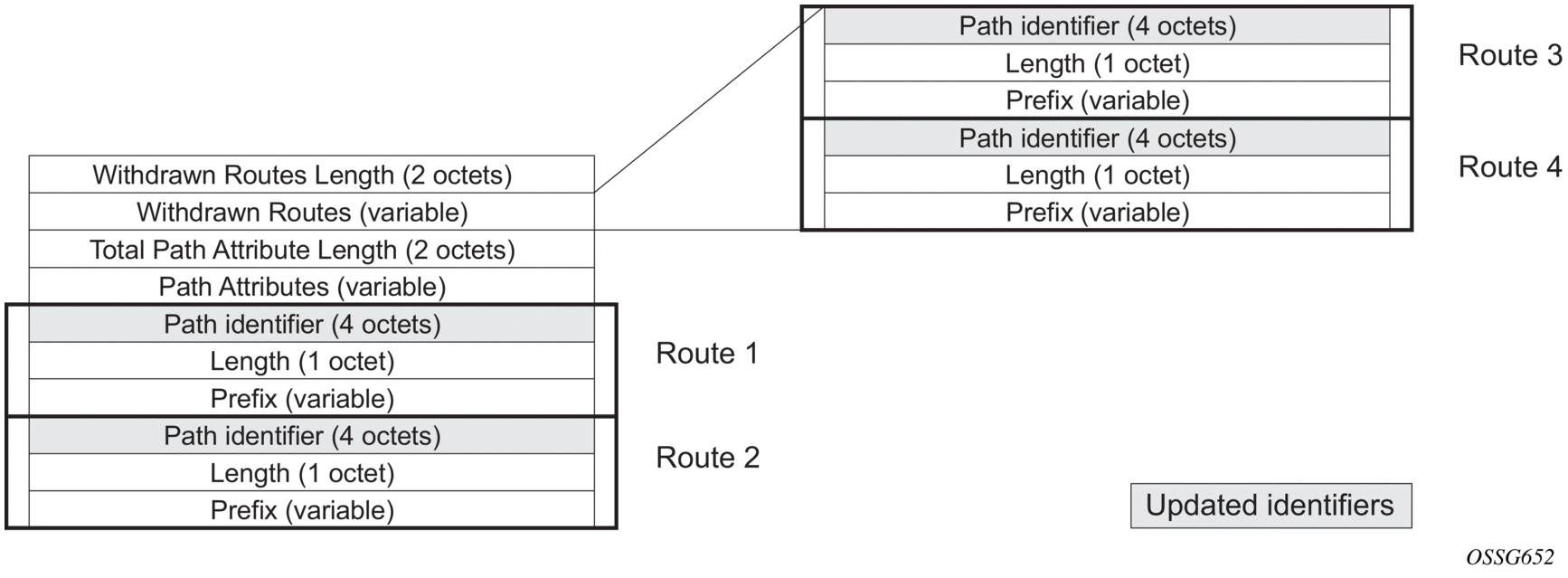 Update messages are used to advertise and withdraw routes. An Update message provides the following information: