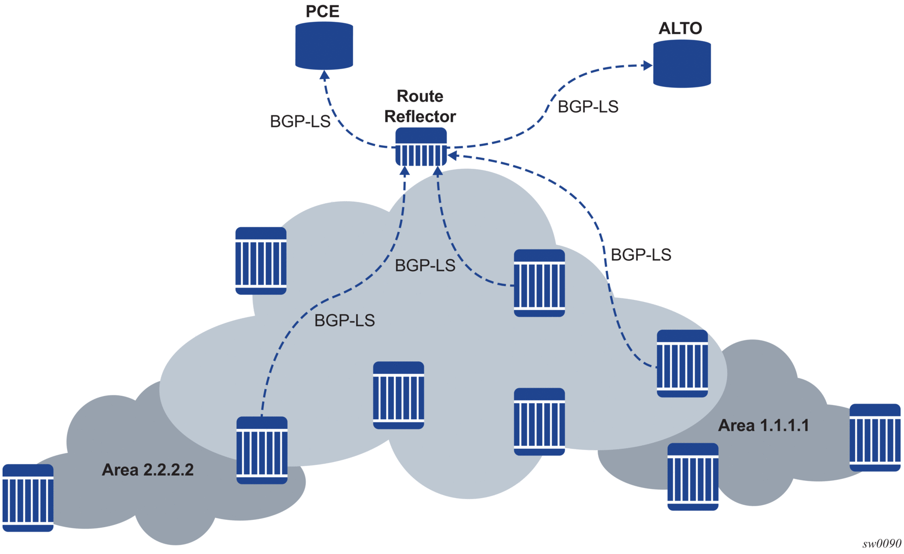 BGP-LS provides external ALTO and PCE servers with topology information for a multi-area or multi-level network. Through the use of one or two BGP-LS speakers per area or level, the external ALTO or PCE servers can receive full topology information for the entire network. The BGP-LS information can also be distributed through route reflectors supporting the BGP-LS to minimize the peering requirements.