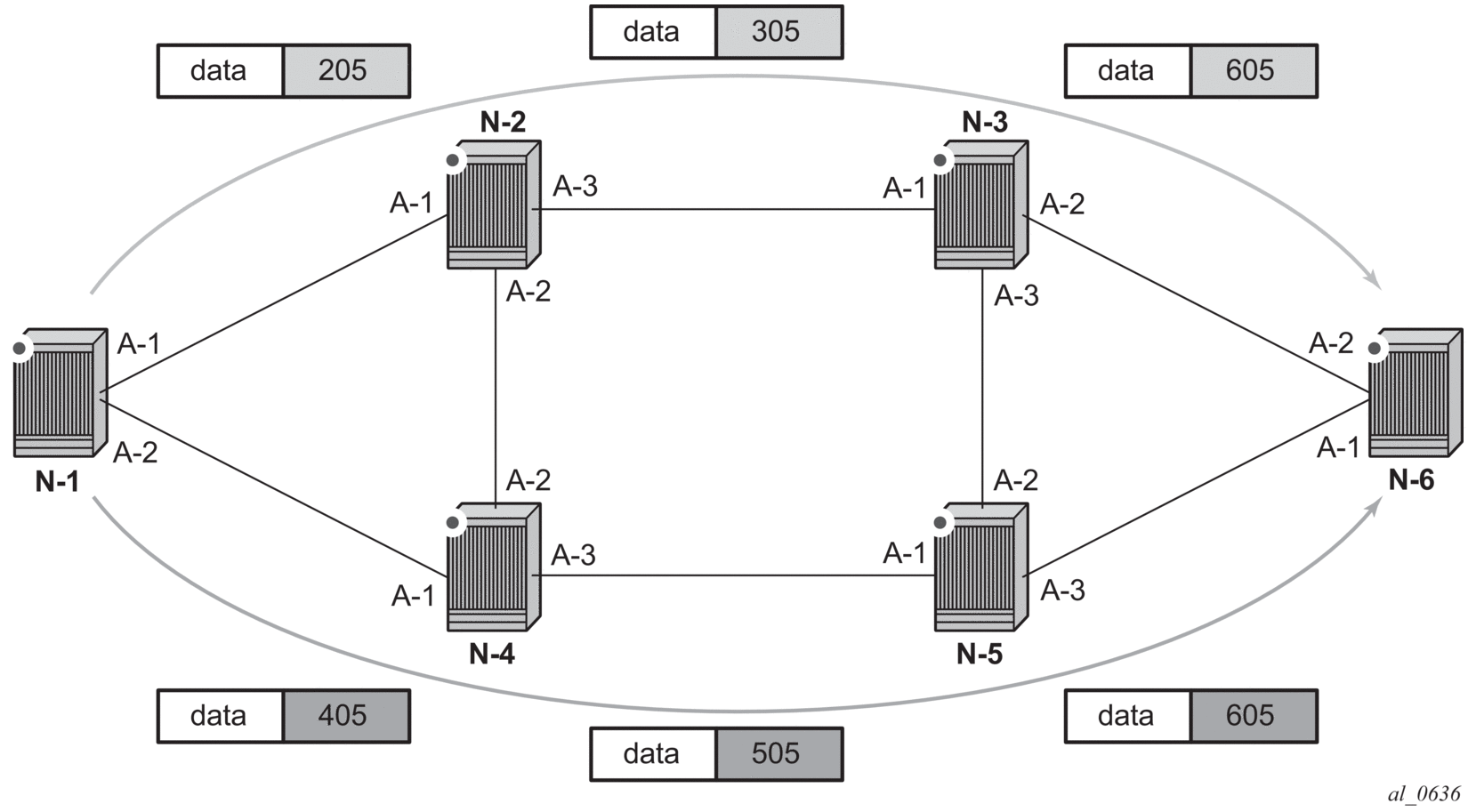 N-1 has an SR tunnel to N-6 with two ECMP paths. It pushes label 205 when forwarding an IP or service packet to N-6 via downstream next-hop N-2 and pushes label 405 when forwarding via downstream next-hop N-4.