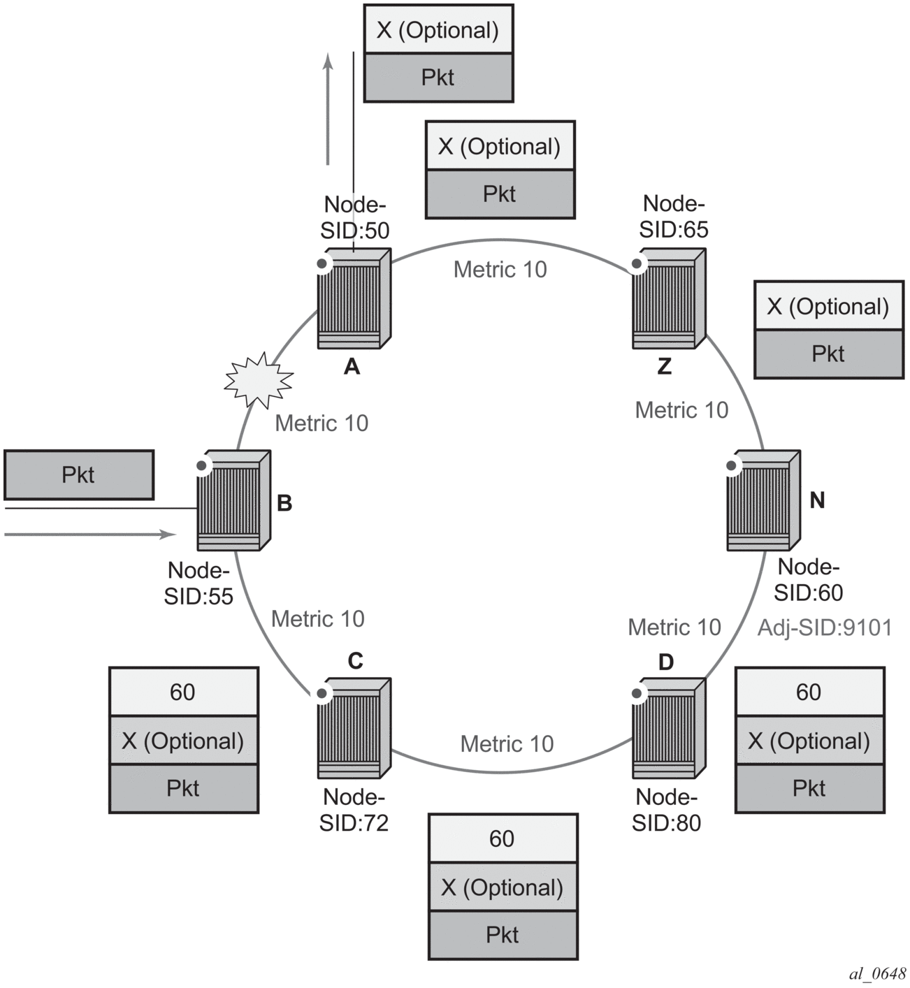 When node N receives the packet while the remote LFA next-hop is activated, it pops the top segment routing label which corresponds to a local node SID. This results in popping this label and forwarding of the packet to the ASBR node over the shortest path (link N-Z).