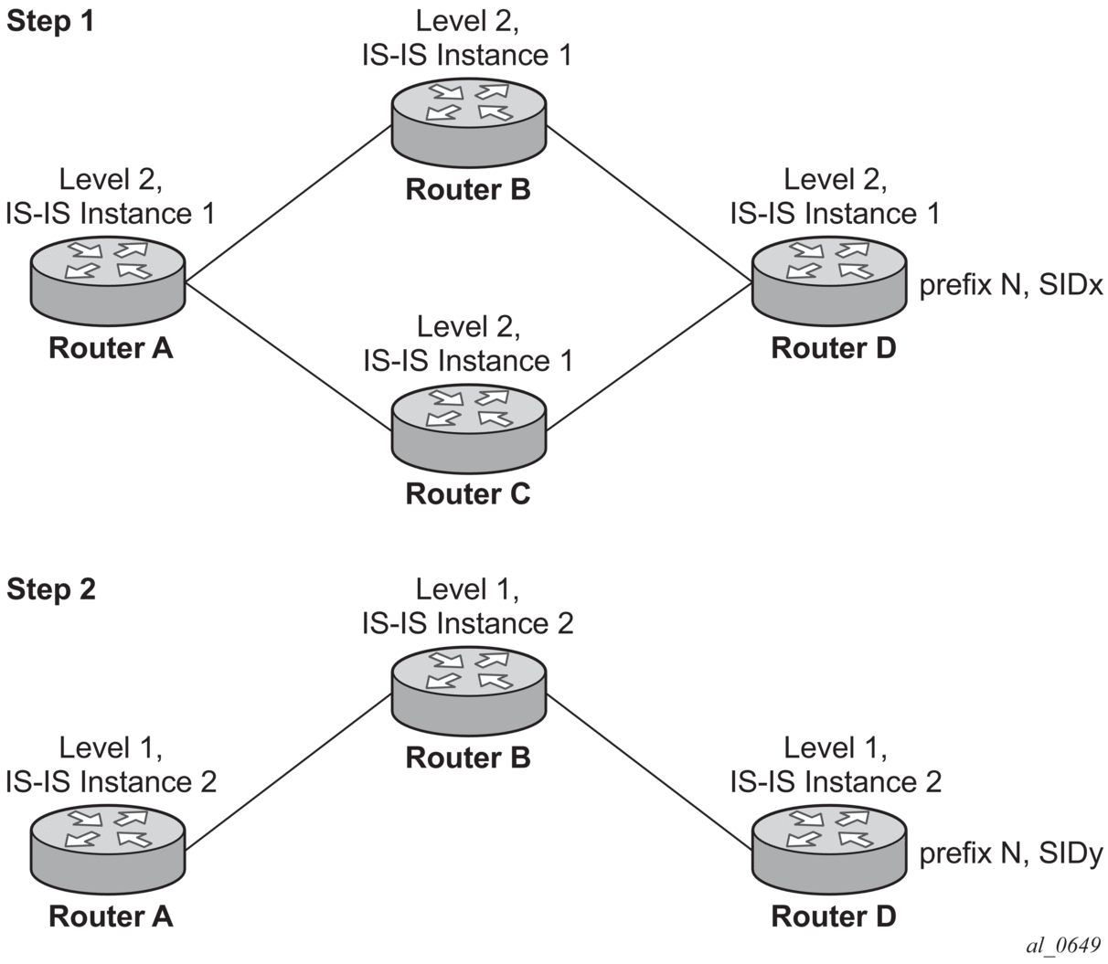 For example: In two different instances (L2, IS-IS instance 1 and L1, IS-IS instance 2—see Figure 18), Router D has the same prefix destination, with different SIDs (SIDx and SIDy).