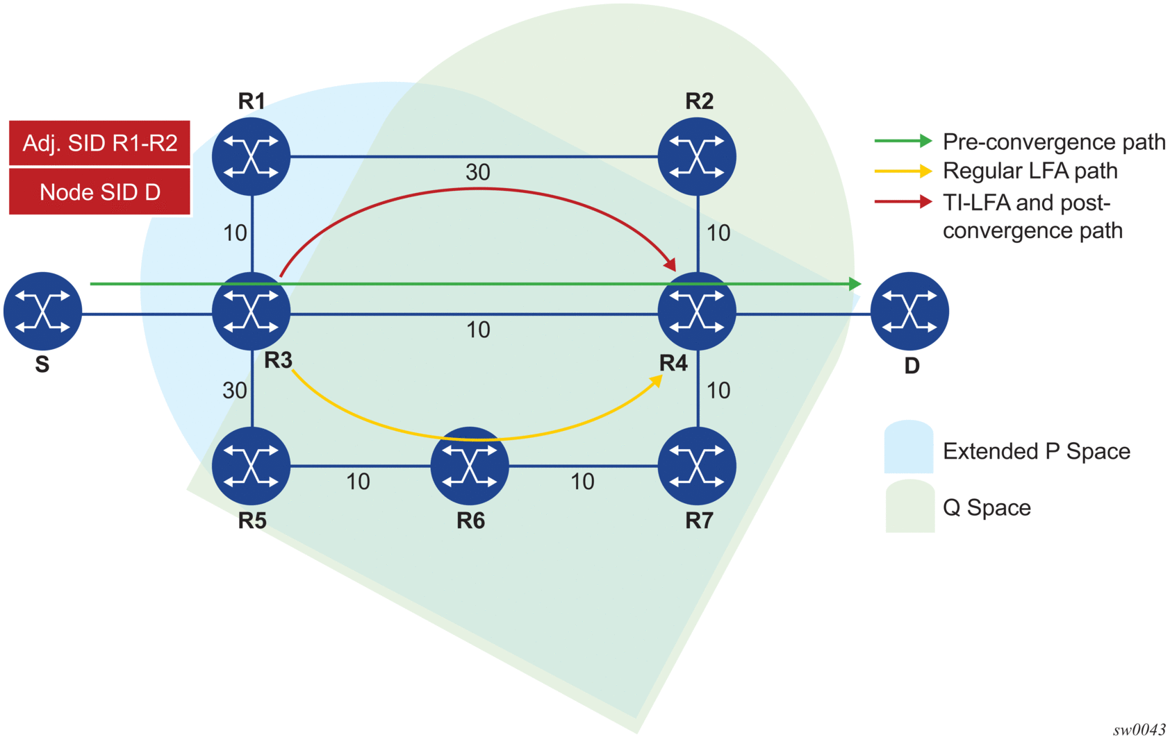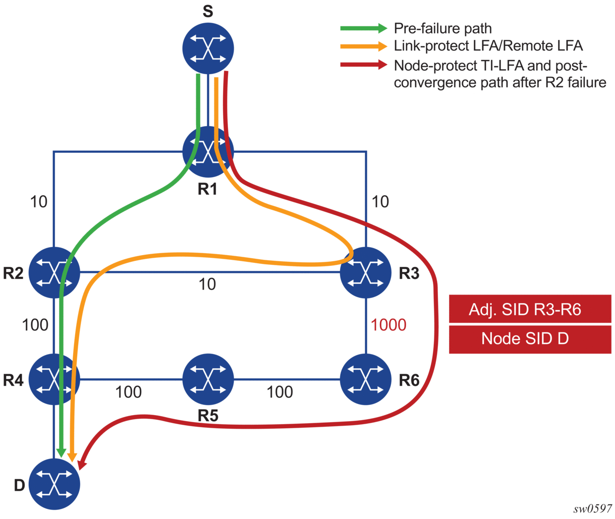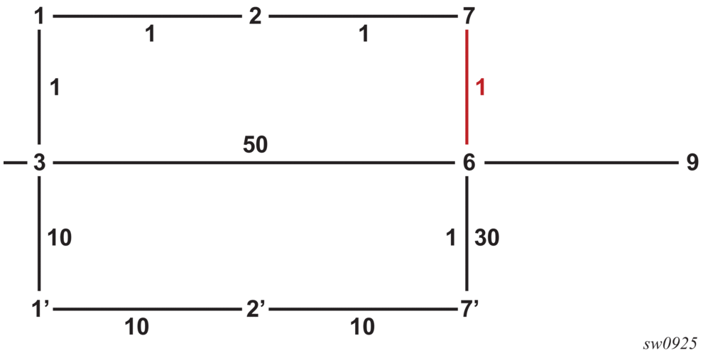The SR OS micro-loop avoidance algorithm provides a loop-free mechanism in accordance with IETF draft-bashandy-rtgwg-segment-routing-uloop. The algorithm supports a single event on a P2P link or broadcast link with two neighbors for only the following cases: