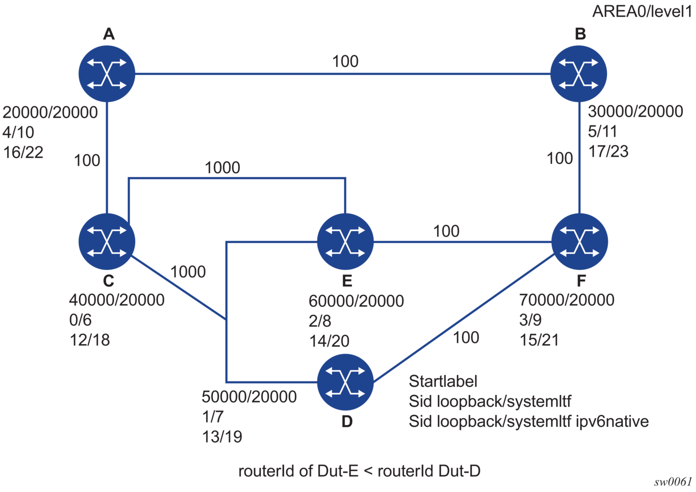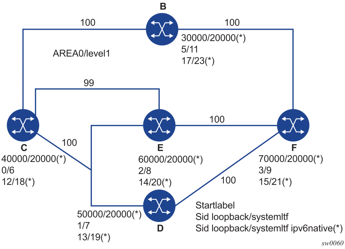 Above commands should fail if the network interface is not of type loopback or if the interface is defined in an IES or a VPRN context. Also, assigning the same SID index/label value to the same interface in two different IGP instances is not allowed within the same node.
