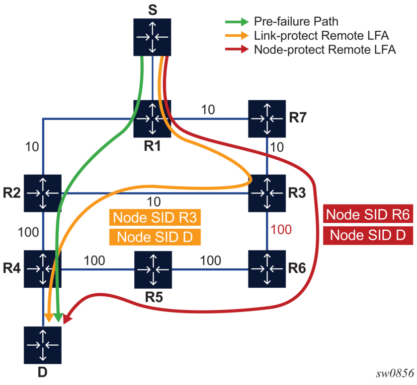 Segment routing introduces the remote LFA feature which expands the coverage of the LFA by computing and automatically programming SR tunnels which are used as backup next-hops. The SR shortcut tunnels terminate on a remote alternate node which provides loop-free forwarding for packets of the resolved prefixes. When the loopfree-alternates option is enabled in an IS-IS or OSPF instance, SR tunnels are protected with an LFA backup next-hop. If the prefix of a given SR tunnel is not protected by the base LFA, the remote LFA automatically computes a backup next-hop using an SR tunnel if the remote-lfa option is also enabled in the IGP instance.