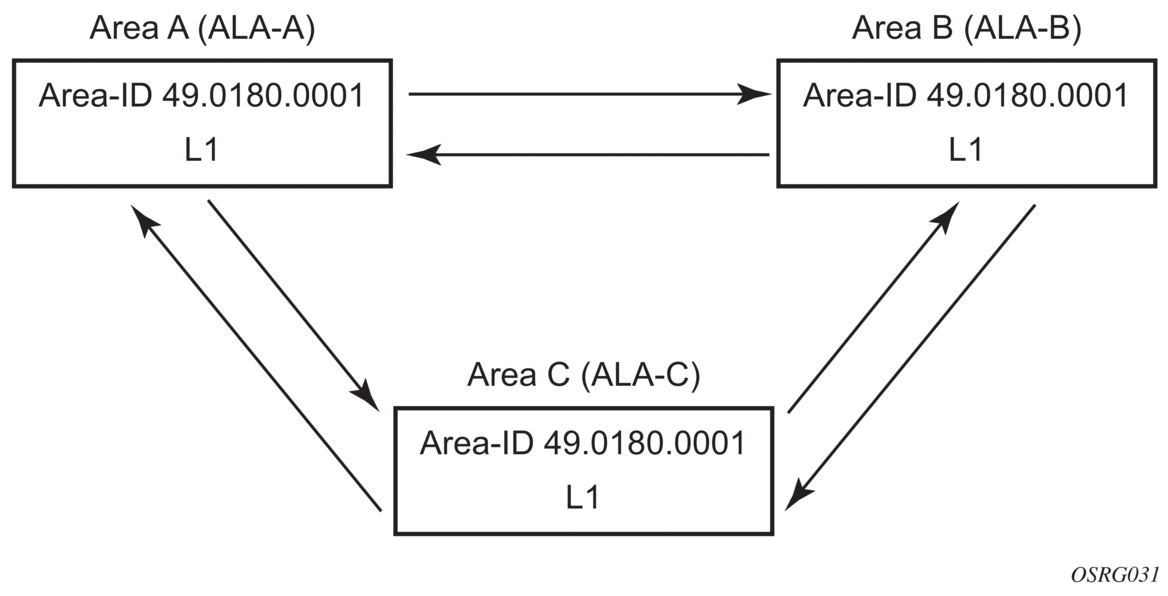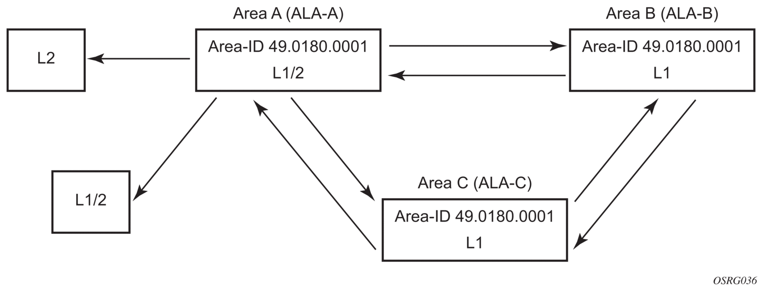 Nokia’s implementation of IS-IS route leaking is performed in compliance with RFC 2966, Domain-wide Prefix Distribution with Two-Level IS-IS. As previously stated, IS-IS is a routing domain (an autonomous system running IS-IS) which can be divided into Level 1 areas with a Level 2-connected subset (backbone) of the topology that interconnects all of the Level 1 areas. Within each Level 1 area, the routers exchange link state information. Level 2 routers also exchange Level 2 link state information to compute routes between areas.