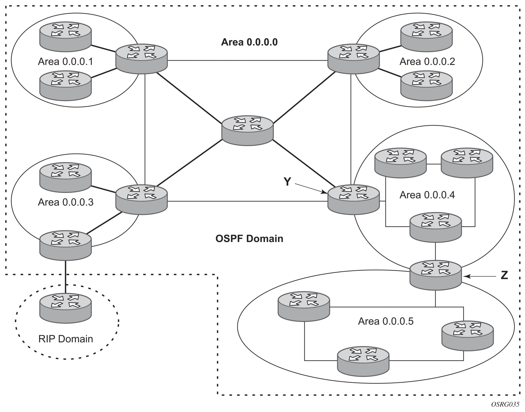 The OSPF backbone area, area 0.0.0.0, must be contiguous and all other areas must be connected to the backbone area. The backbone distributes routing information between areas. If it is not practical to connect an area to the backbone (see Area 0.0.0.5 in Figure 13) then the area border routers (such as routers Y and Z) must be connected via a virtual link. The two area border routers form a point-to-point-like adjacency across the transit area (see Area 0.0.0.4). A virtual link can only be configured while in the area 0.0.0.0 context.