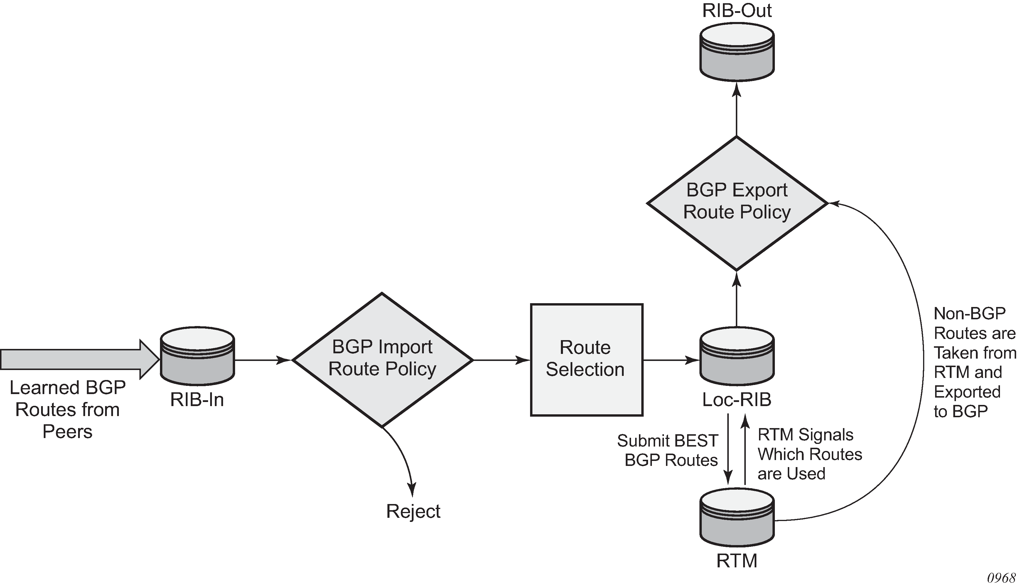 OSPF and BGP requires route policy support. Figure: BGP route policy diagram and Figure: OSPF route policy diagram display where route policies are evaluated in the protocol. Figure: BGP route policy diagram depicts BGP which applies a route policy as an internal part of the BGP route selection process. Figure: OSPF route policy diagram depicts OSPF which applies routing policies at the edge of the protocol, to control only the routes that are announced to or accepted from the Route Table Manager (RTM).