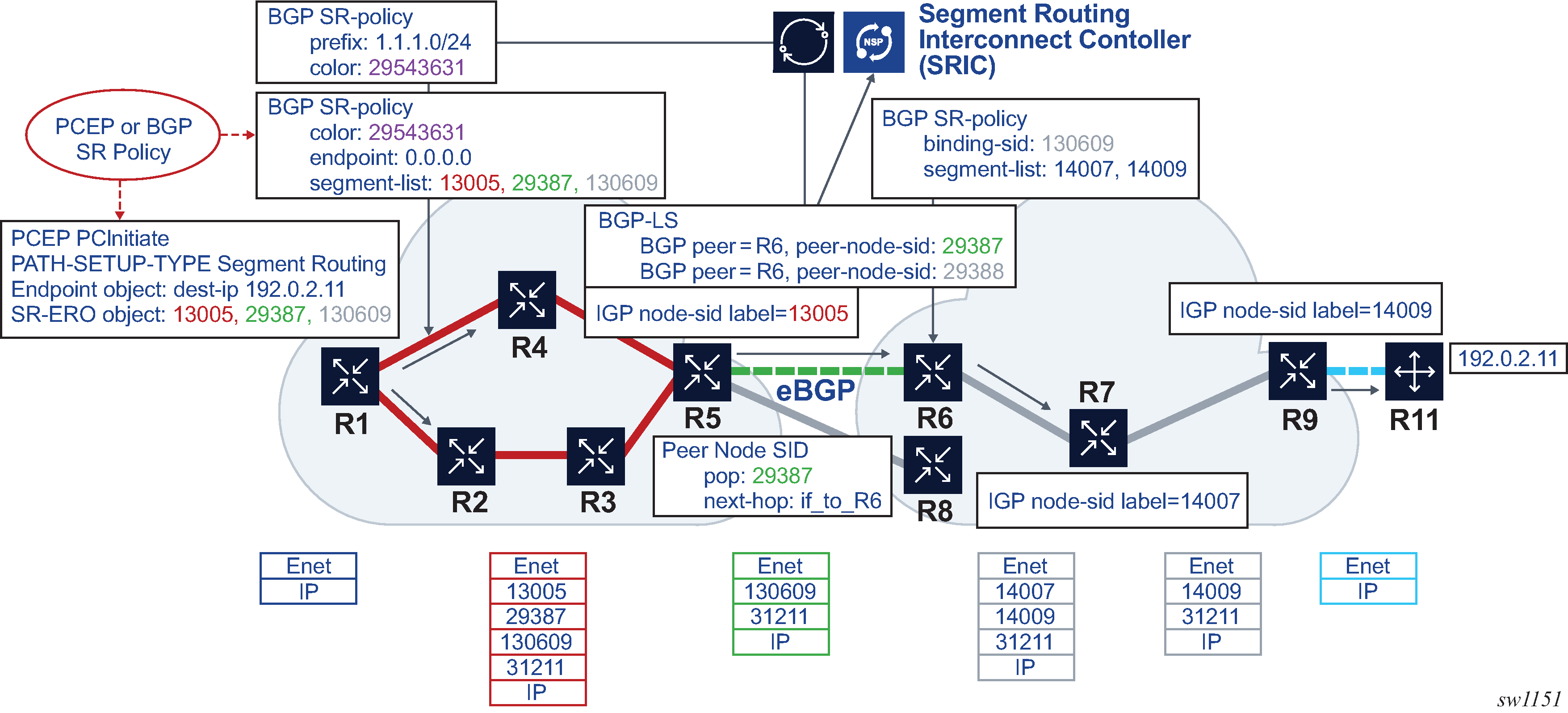 In this example, there are two IGP domains with eBGP running between R5 and R6, and between R5 and R8. These adjacencies are not visible to R1, which is external to the IGP domain. At R5, separate peer node SIDs are allocated for R6 and R8. The peer node SIDs are advertised to the Nokia NSP in BGP-LS. This allows the NSP to compute a path across either the R5-R6 adjacency or the R5-R8 adjacency by including the appropriate peer node SID in the path. In the preceding use case, the R5-R6 adjacency is preferable. This peer node SID can be included in either the SR-ERO of an SR-TE LSP that is computed by PCEP or the segment list of BGP SR policy that is programmed at R1. Traffic on this LSP or SR policy is, therefore, steered across the required peering.