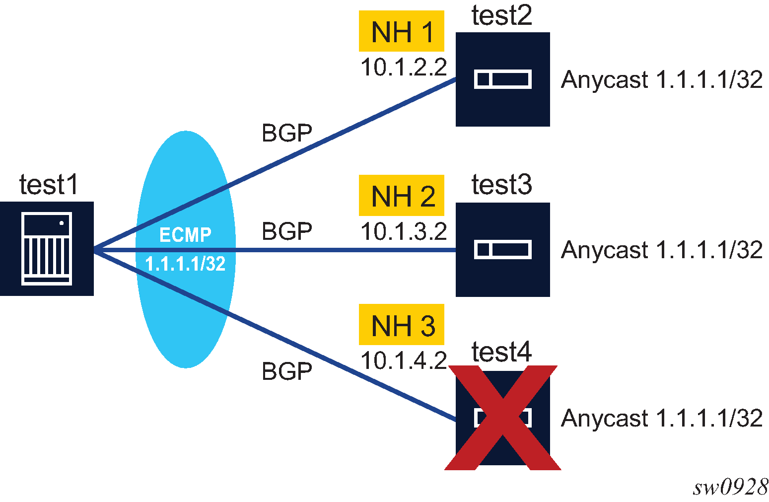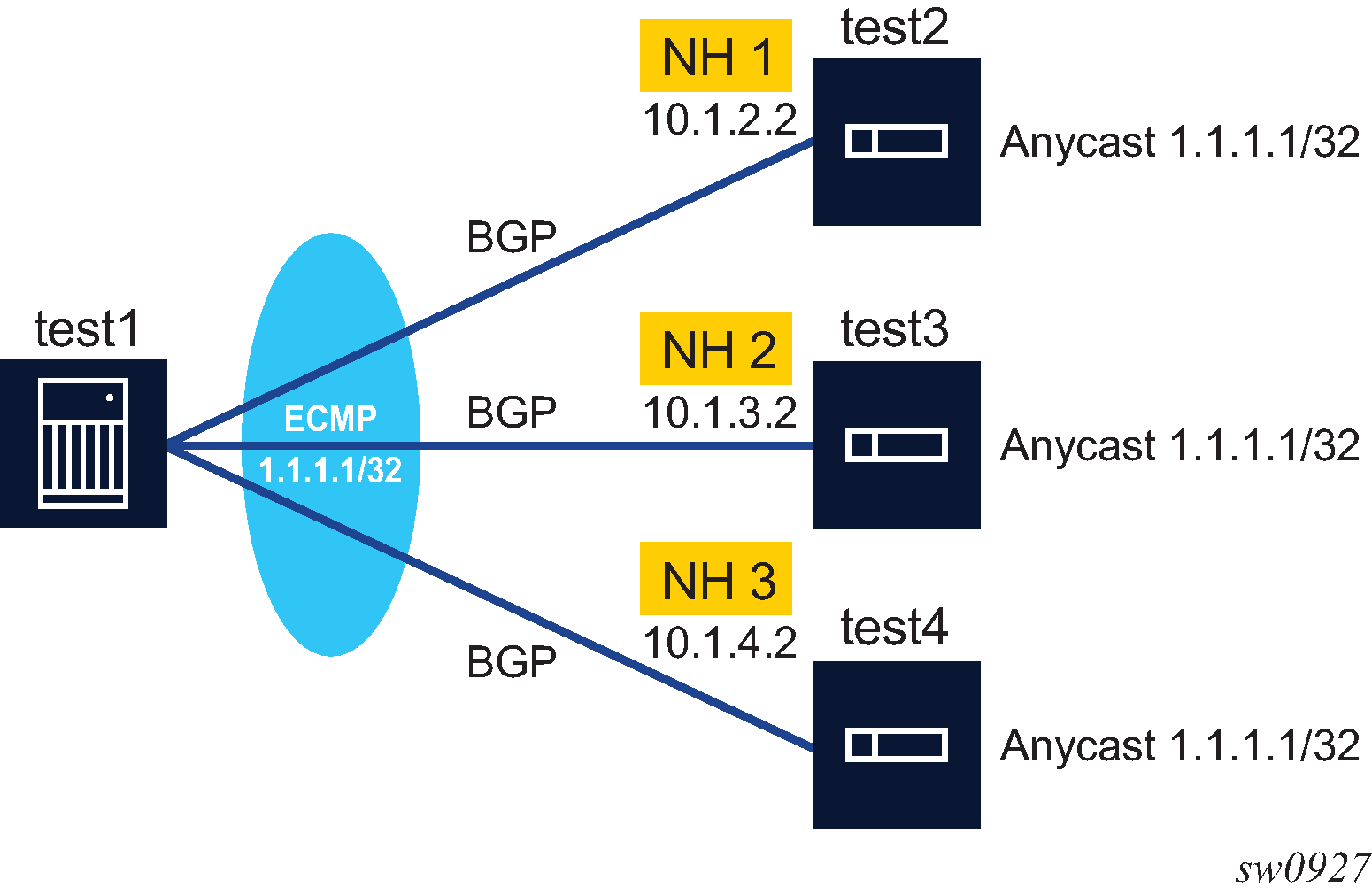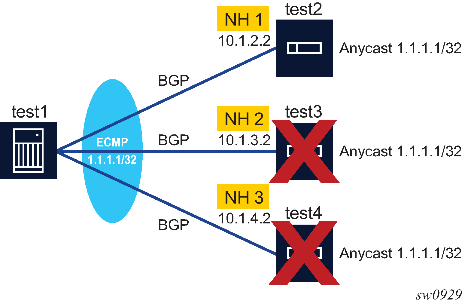| Initial sticky ECMP distribution for 1.1.1.1/32 in Figure: Sticky ECMP flow distribution as next hops are removed part 1 | ECMP distribution for 1.1.1.1/32 if next hop 3 fails in Figure: Sticky ECMP flow distribution as next hops are removed part 2 | ECMP distribution for 1.1.1.1/32 if next hop 2 subsequently fails in Figure: Sticky ECMP flow distribution as next hops are removed part 3 | |||