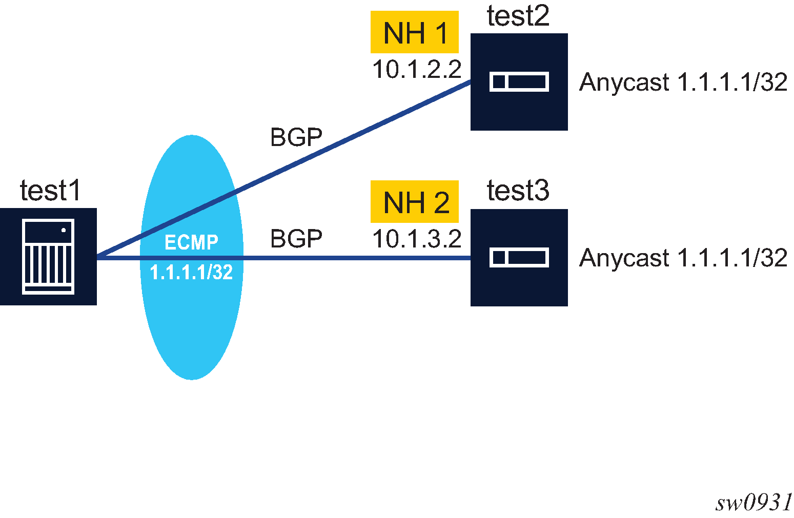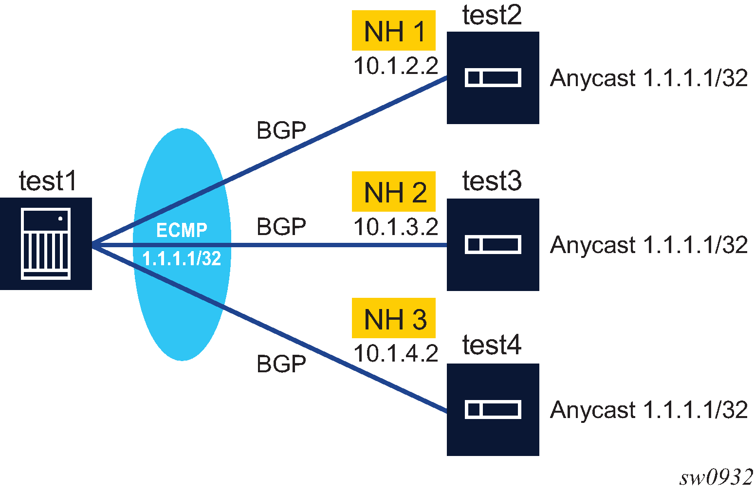 | Initial sticky ECMP distribution for 1.1.1.1/32 in Figure: Sticky ECMP flow distribution as next hops are added part 1 | ECMP distribution for 1.1.1.1/32 if next hop 2 becomes available in Figure: Sticky ECMP flow distribution as next hops are added part 2 | ECMP distribution for 1.1.1.1/32 if next hop 3 additionally becomes available in Figure: Sticky ECMP flow distribution as next hops are added part 3 | |||